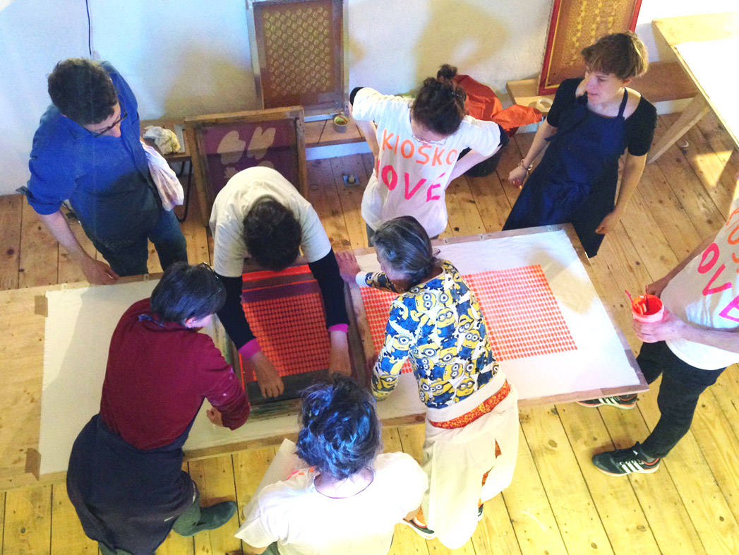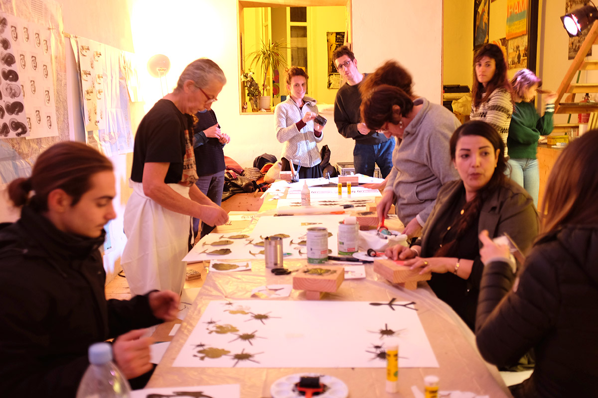 De janvier à avril 2019, nous nous intéressons à la sérigraphie et à la confection d’objets textiles. Ces ateliers reposent sur deux types d’aspects : des ressources que nous mettons à disposition des participants : un espace de travail, des matériaux, des outils, des connaissances techniques et nos propres envies d’apprentissage, et celles que les habitants apportent : des matières glanées, leurs idées, leurs savoir-faire et leurs expériences personnelles. La part belle est faite au tâtonnement, à l’entraide et au hasard.