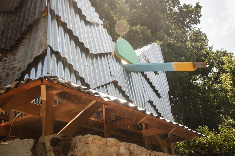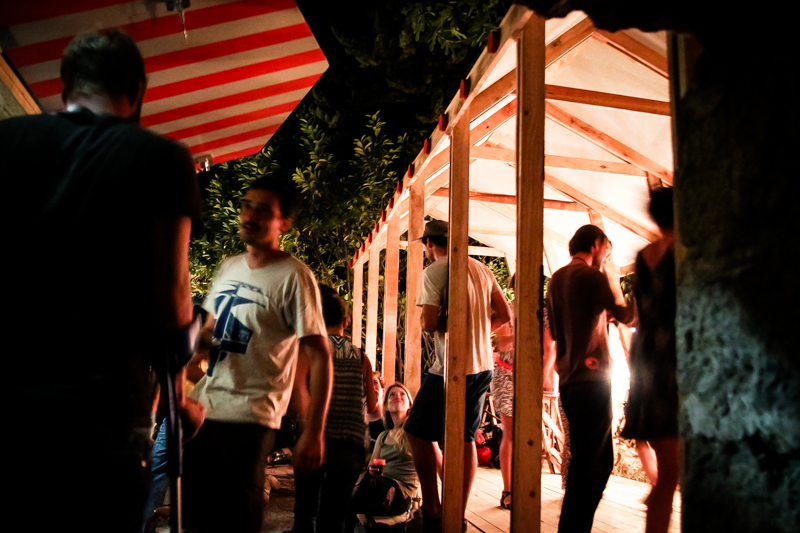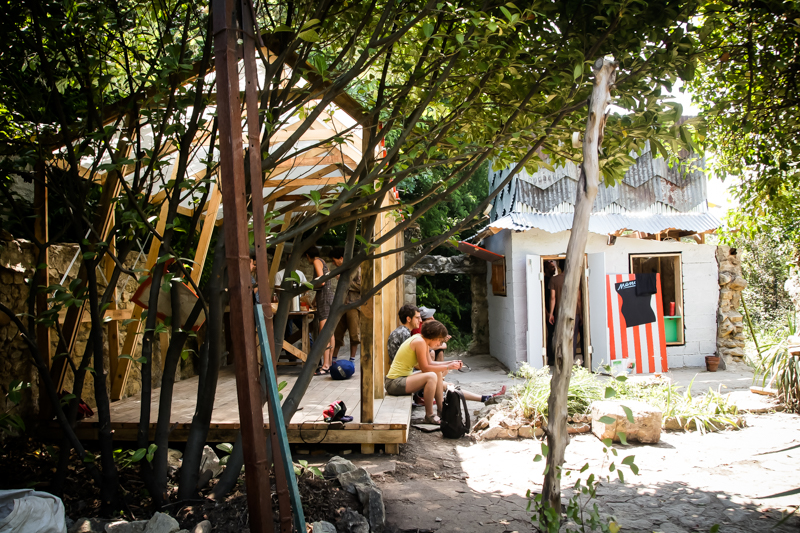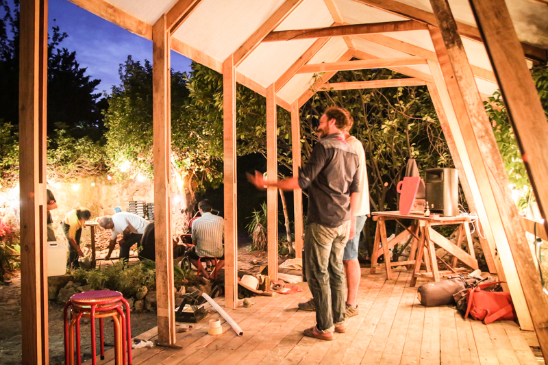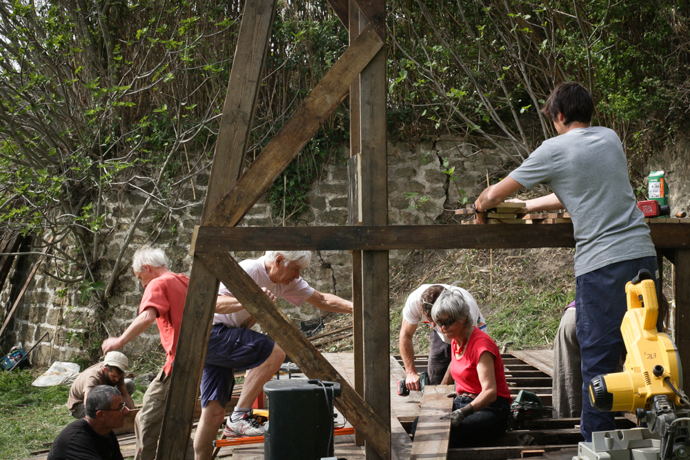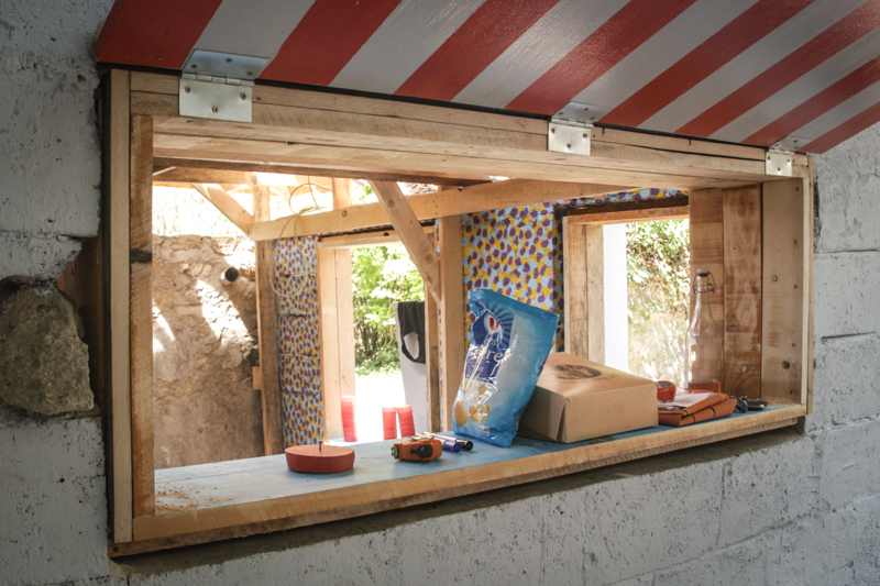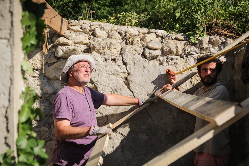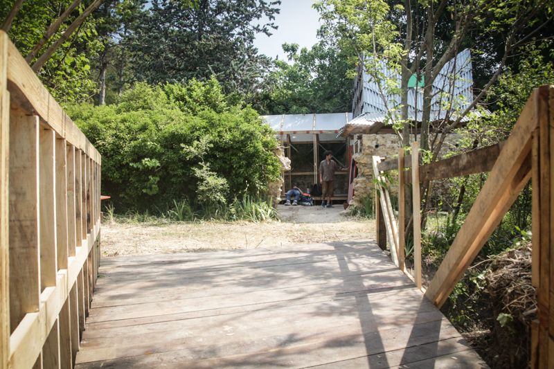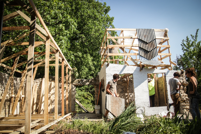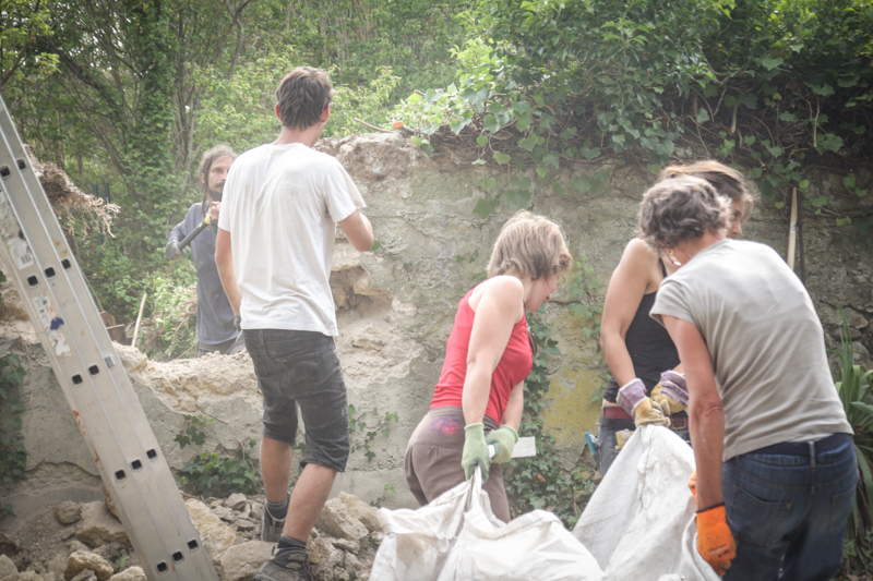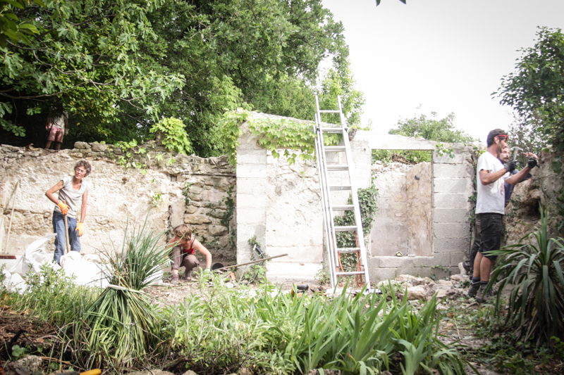 Une deuxième phase de chantier s’est déroulée la semaine du 01 juin 2015. Plus de monde sur le chantier, et Adrien Zammit s’est associé à Pierre Tandille pour poursuivre le travail graphique. Le bâtiment du moulin n’étant pas accessible, les travaux nécessaires étant trop lourd, la guinguette a pris place au cœur d’anciens appentis en ruine, dans le jardin haut. En guise d’échauffement, la préparation du terrain. Il a fallu défricher, ouvrir certains murs, faire tomber des constructions branlantes. Et c’était parti pour une semaine de chantier intense, sous un soleil de plomb.