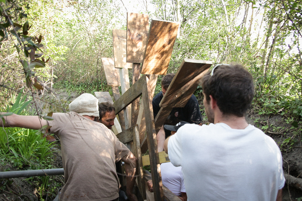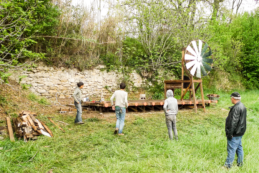 Une première phase de chantier s’est déroulée du vendredi 17 au dimanche 19 avril 2015. Au programme de cette première session, la construction d’une terrasse / scène, la réalisation d’une nouvelle signalétique qui annonce le café et son programme, et le montage d’une roue à aube qui transmet sa rotation à la roue éolienne en façade de la terrasse, symbole du renouveau du moulin. De quoi aborder le printemps sereinement.