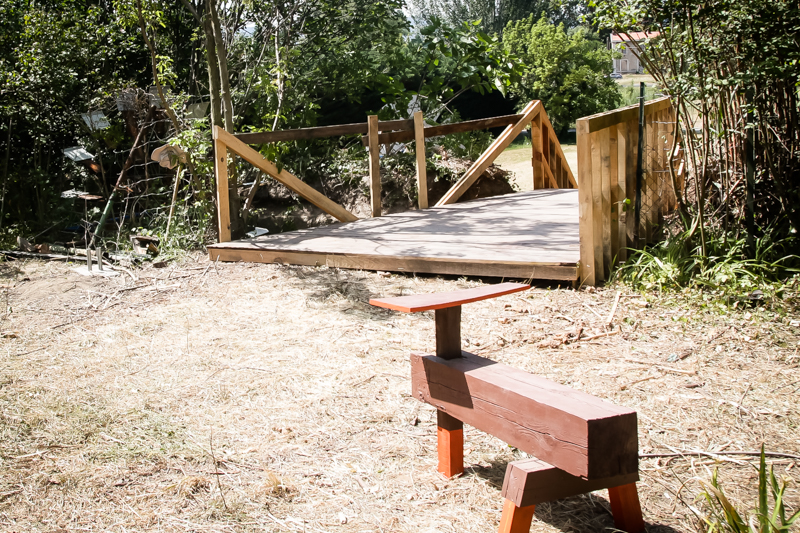 D’un côté on a créé l’accès depuis la terrasse basse pour enjamber le mûr et le canal du moulin pour arriver dans le jardin haut, là où la guinguette du café prenait peu à peu forme.