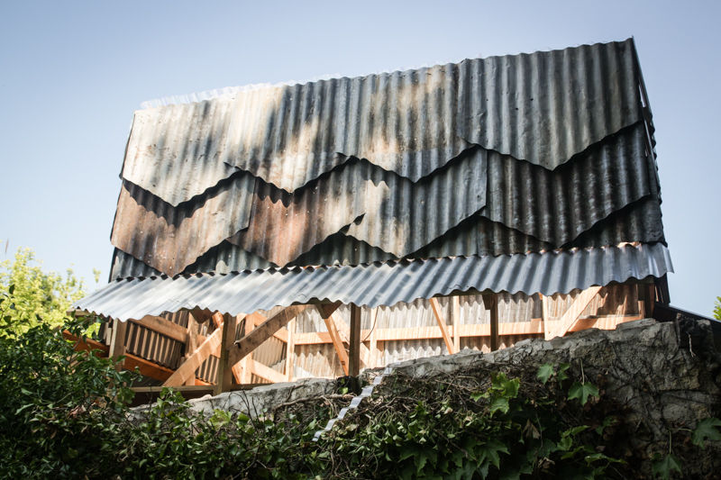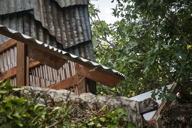 De l’autre, on a organisé la guinguette. Le café proprement dit doit accueillir un peu de stockage, c’est le seul espace vraiment « clos et couvert ». On a récupéré de vielles tôles pour la toiture et on en a racheté de nouvelles. En parallèle une terrasse abritée prenait forme. Chaque élément est autoporteur et indépendant des anciennes maçonneries. Le tout s’articule dans l’enceinte d’un ancien mûr formant une sorte de patio. On nettoie, on ouvre, on construit…