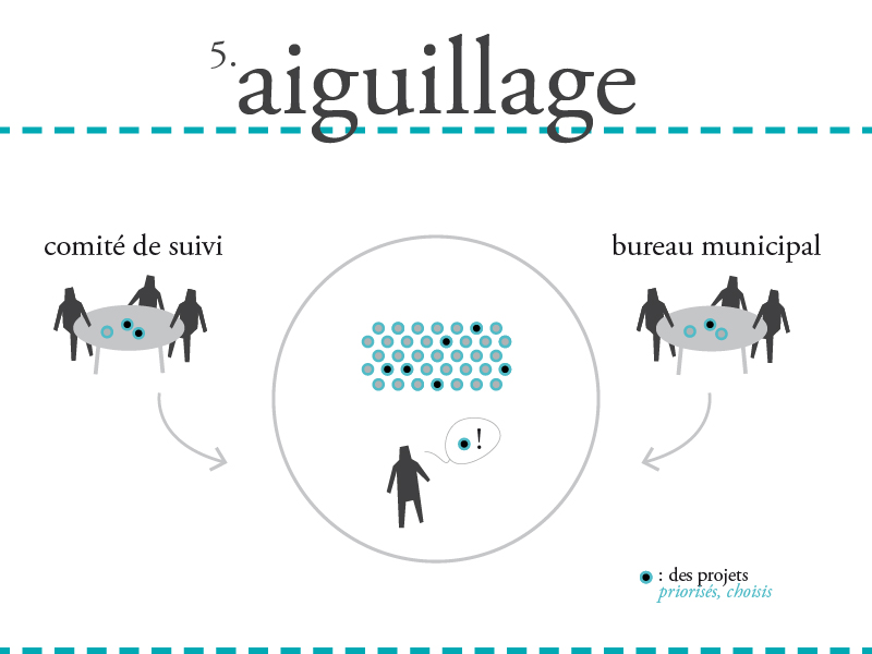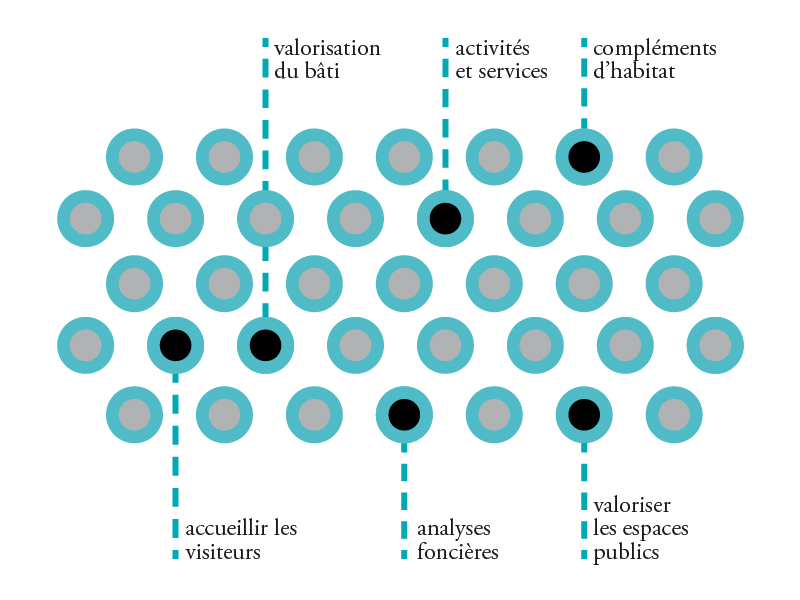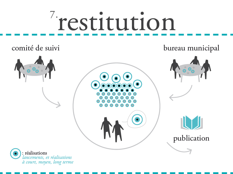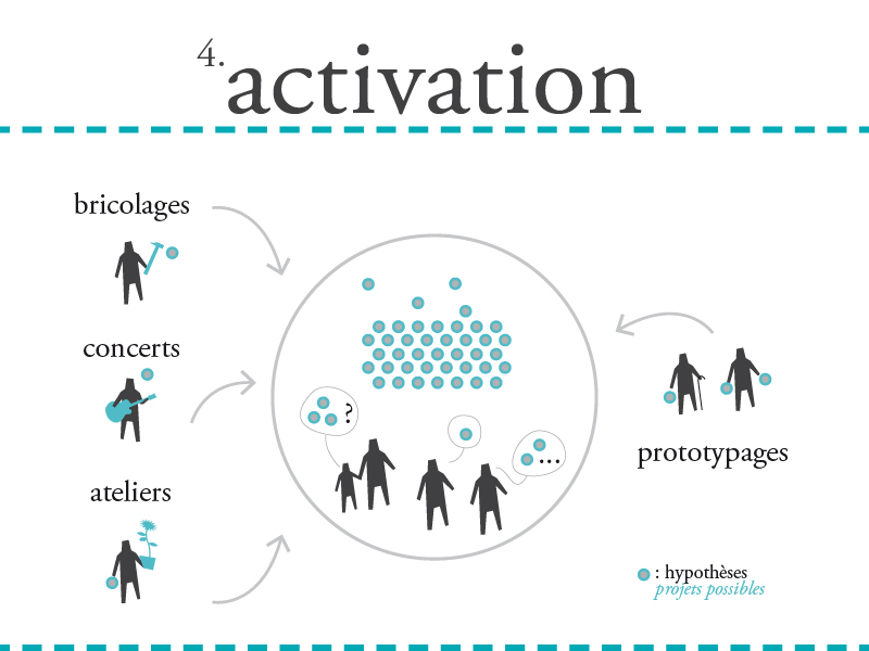 La méthode d’intervention que nous avons proposé d’expérimenter se déroule en sept phases : 1. Installation : commencer par s’installer dans la commune pour y travailler, y vivre et tenir un lieu ouvert à tous. Ce lieu de résidence c’est dans un bâtiment vacant du centre-bourg. 2. Récolte : Puis très vite, rencontrer nos voisins, habitants et acteurs locaux. Sans a priori ni idées préconçues, en cherchant à identifier quels étaient les freins et leviers au dynamisme du centre-bourg de Châteldon. 3. Hypothèses : Ensuite, s’arrêter et prendre le temps de faire émerger des hypothèses de ces multiples discussions. Après synthèse, voir se dessiner une série de projets potentiels, réalisables à plus ou moins long terme. Des possibles rêvés, concrétisables à condition qu’ils soient relayés, certes par la collectivité, mais aussi par des citoyens et groupes locaux motivés. 4. Activation : Et reprendre en fanfare ! Au cours d’une semaine festive, présenter à tous ces idées nées de chacun. Inviter les châteldonnais à réagir sur l’ensemble des hypothèses proposées. Et pour cela, rien de mieux que d’en tester grandeur nature ! 5. Aiguillage : Que faire maintenant ? C’est l’objet de ce 5ème temps : faire le bilan de toutes les propositions et toutes les réactions qu’elles ont pu provoquer. Ce fut le moment de choisir collectivement quels projets développer pour la suite. 6. Développement : Puis passer à l’action : développer les projets sélectionnés. Des groupes de travail sont définis pour travailler à la réalisation ou la mise en place d’un certain nombre de projets, chantiers, et dossiers stratégiques. 7. Restitution : La fin de l’étude fut marquée par une restitution publique de notre travail, le 4 mars, et par la publication d’un livre. L’objectif : faire que ces dynamiques amorcées ne s’éteignent pas dès notre départ. Transmettre les projets aux porteurs pour assurer la continuité de la démarche.
