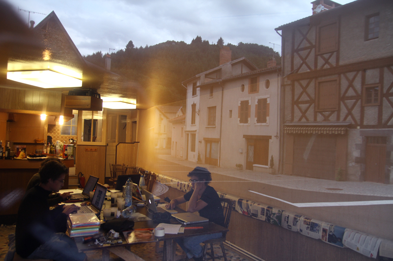 Vous l’aurez deviné, le P.O.I.L. est aussi un lieu de vie puisque nous y avons habité pour le temps de l’étude. On ne s’est pas immergé dans les moeurs châteldonnaises à mi-temps : on a aimé y passer soirs et weekends, rendre plus floue la frontière entre travail et temps privé. Nous avons pris possession de l’ancienne cuisine du bar-restaurant, déballé nos valises dans les chambres à l’étage, posé nos posters aux murs et, le soir venu, les espaces de travail se transforment en salon ou en salle de cinéma.