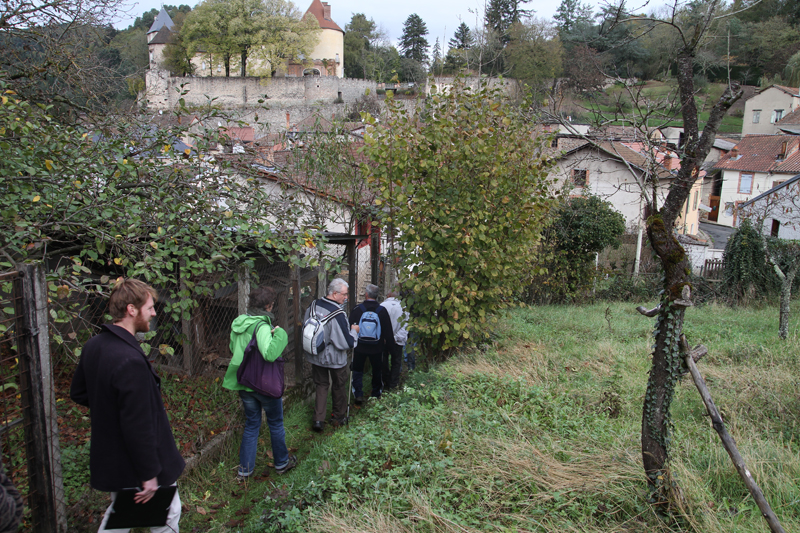 Consacrée à la découverte de Châteldon, la journée du lundi 5 novembre est née de la volonté de valoriser le patrimoine bâti et paysager du centre-bourg, pour les visiteurs mais aussi pour les habitants. L’été, la mairie propose des parcours commentés dans le village. Mais cette offre d’accueil est peu diffusée et les demandes baissent chaque année. Un guide de visite sous forme de dépliant est à disposition pour les visiteurs à la mairie mais aucune signalétique ne se retrouve sur les points d’intérêts du village. Il arrive souvent que des gens de passage se retrouvent sans aucune information sur le village, passant ainsi à côté de belles histoires. Lors de cette journée, deux guides-habitants déjà expérimentés ont proposé une visite commentée du centre-bourg. Le public les a suivis dans les ruelles du village, parcours agrémenté de pauses historiques et anecdotes locales. Ce fut aussi l’occasion de remarquer de nouveaux panneaux informatifs, fabriqués pour l’occasion. Mis en place pour quelques mois, ils permettent de poser la question de la signalétique aujourd’hui inexistante dans le village.