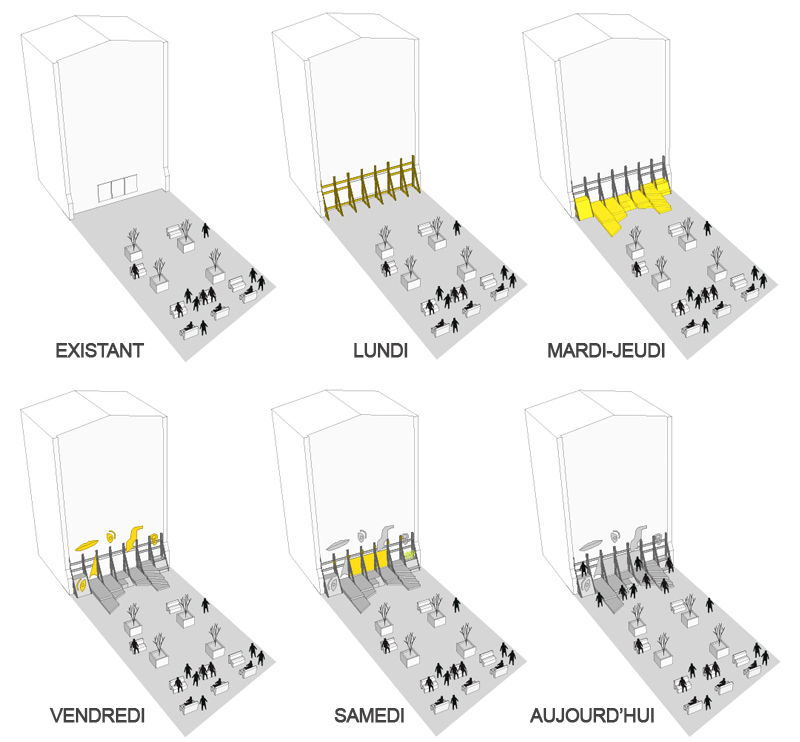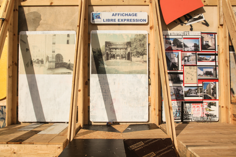 – un travail de réflexion, à l’échelle du quartier, mené par le Bureau de l’Envers : des montages photographiques ont été réalisés, imprimés puis collés à travers le quartier dans différents espaces délaissés, afin de questionner ces lieux et donner à les voir différemment ; le Bureau de l’Envers a ensuite collé une partie de ce travail sur les trois panneaux d’affichage libre situés contre le mur, au milieu de la structure. Avec Pierre Tandille, ils vont continuer à questionner la place et le quartier en alimentant cet affichage tout au long des semaines qui suivent .
