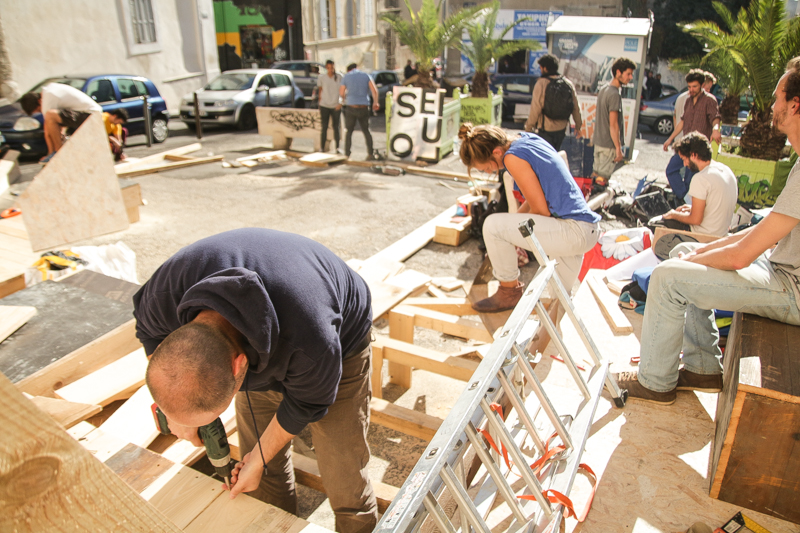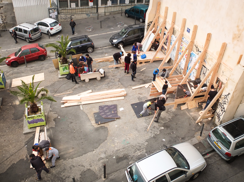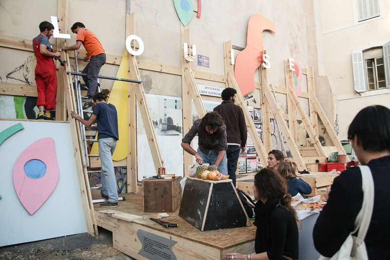 Sur une initiative du Collectif Etc et du Bureau de l’Envers, avec la collaboration du graphiste Pierre Tandille et la complicité de nombreux acteurs du quartiers, nous sommes intervenus sur la place Louise Michel, dans le quartier de Belsunce, à Marseille. C’est suite à divers rencontres que la question de cet espace non-qualifié nous est apparue, et que nous avons souhaité spontanément y réaliser un projet, du 3 au 8 Novembre 2014. Pas de budget, pas de commanditaire, simplement l’envie de soutenir des dynamiques habitantes et de fabriquer sous le soleil.