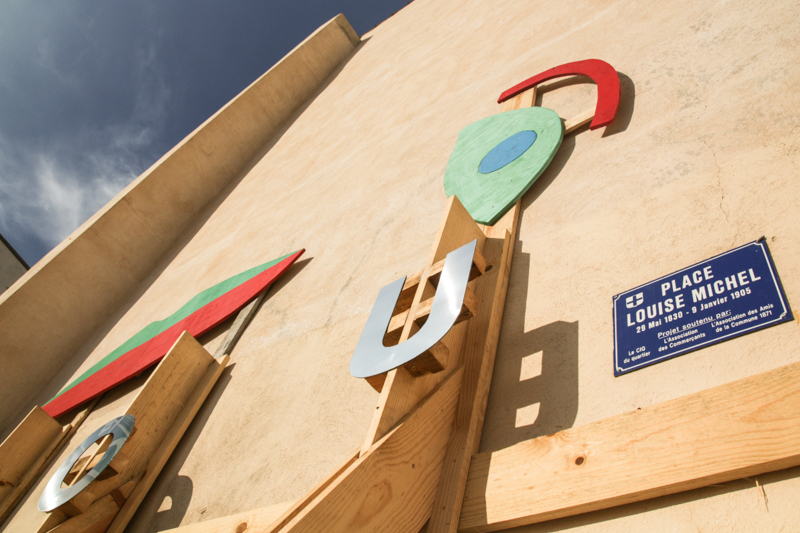 – un travail graphique, piloté par Pierre Tandille, sur des formes colorées représentant le visage déstructuré de Louise Michel, de différentes couleurs et disposées sur la structure ; un lettrage en miroir, marquant « Louise », jouant sur une certaine familiarité ou proximité avec Louise Michel, et renforçant l’identité récente de cet espace public.