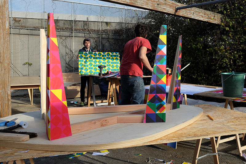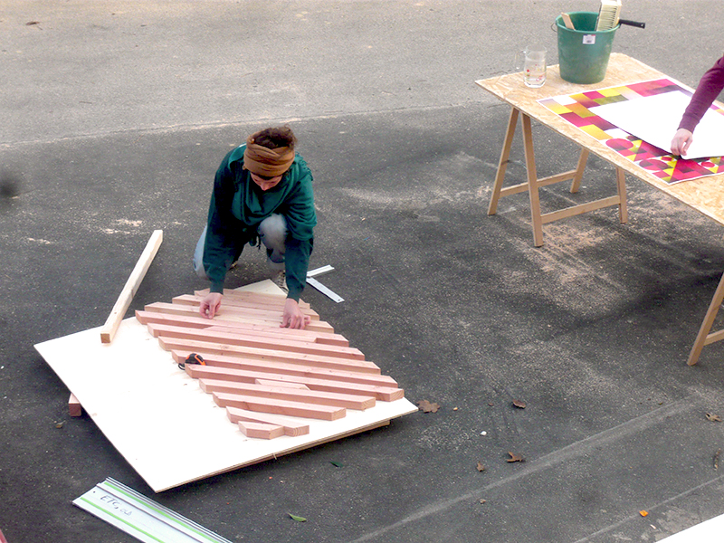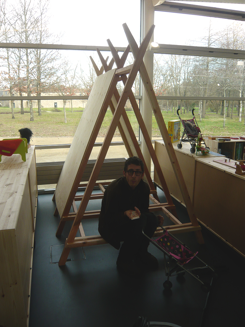 Suite à l’appel d’offre que nous avons remporté, nous proposons à Super Terrain de collaborer avec nous, nos amis/graphistes de longue date avec qui nous avons déjà travaillés sur d’autres projets et que nous contactons toujours au dernier moment. Le projet consiste à « pimper » le mobilier existant pour qu’il soit mieux adapté à la ludothèque en étroite discussion avec sa responsable. Nous hésitons habituellement à répondre à ce type de commande, mais ce cadre inédit de projet pour nous, le côté ludique de la demande, les perspectives de collaboration avec Super Terrain et notre situation économique à ce moment-là ont pesé dans la balance. Nous avons réalisé une pergolas pour rampants, une cabane pour enfants, une grande table de jeux, une petite table à playmobil. En voici quelques images.
