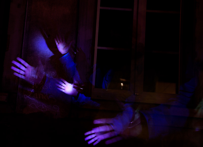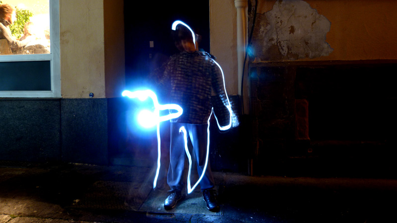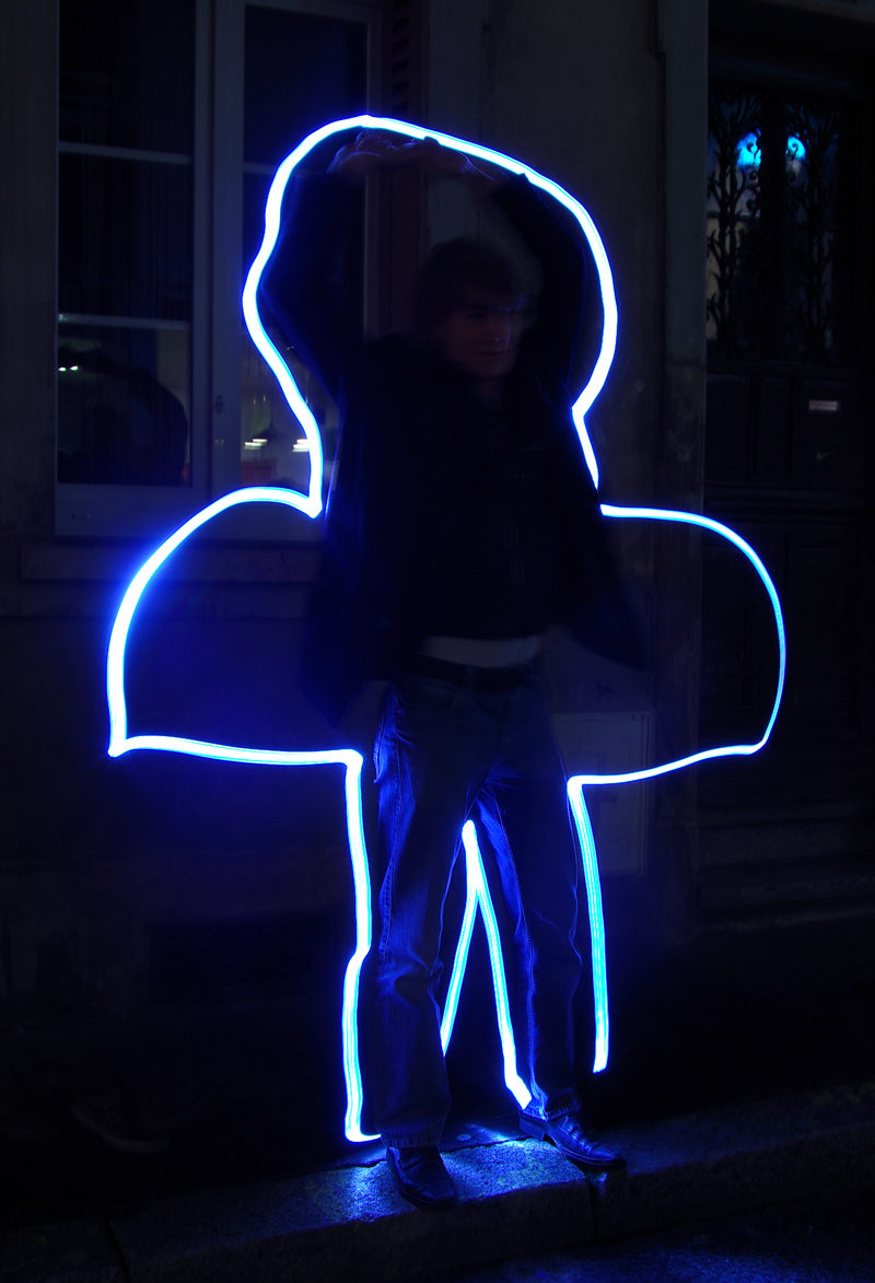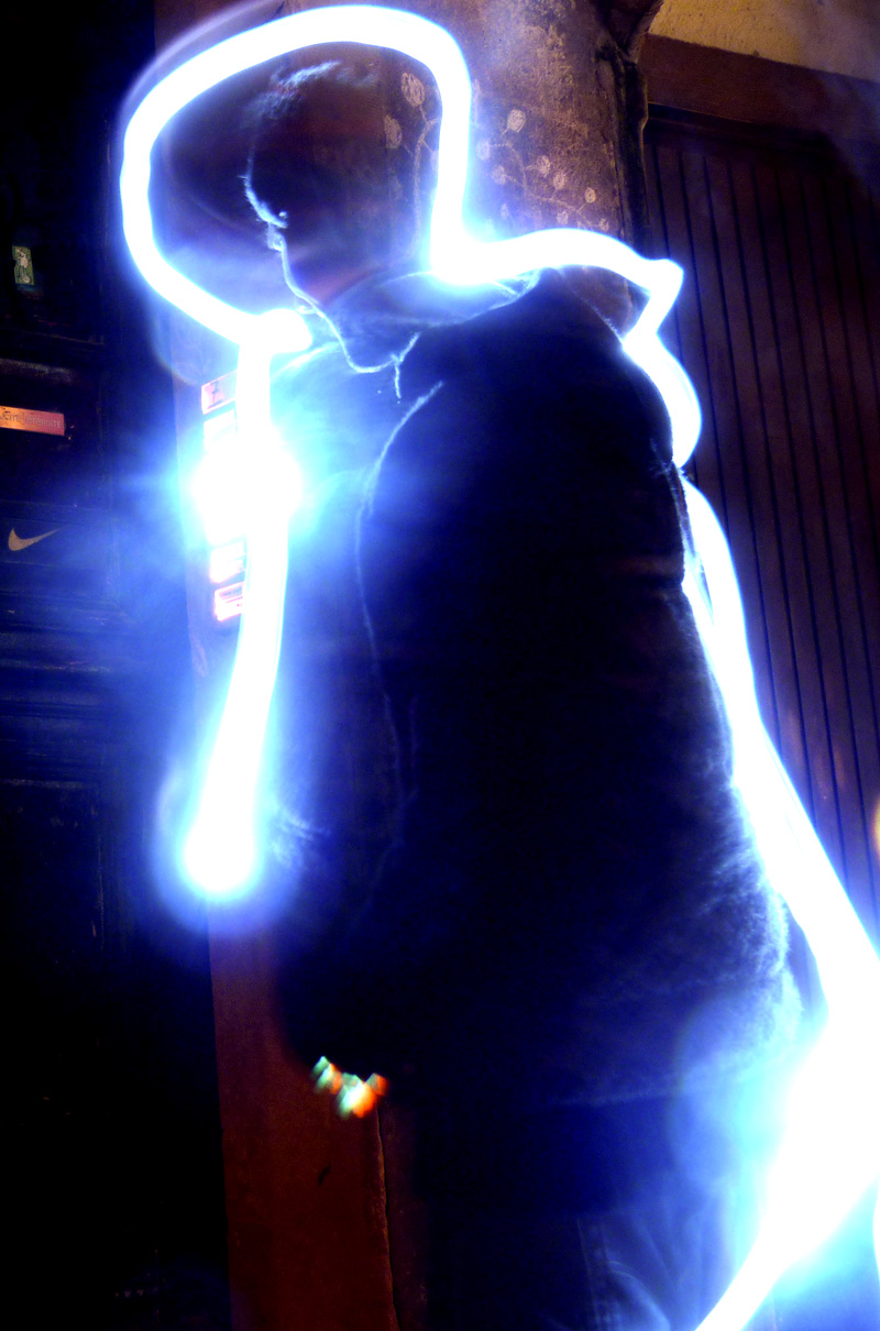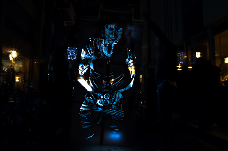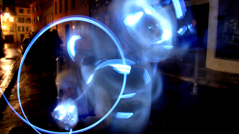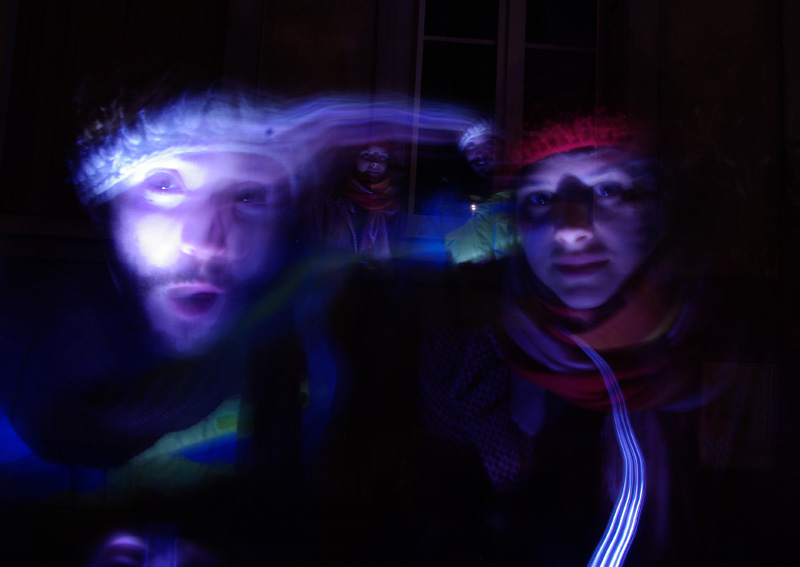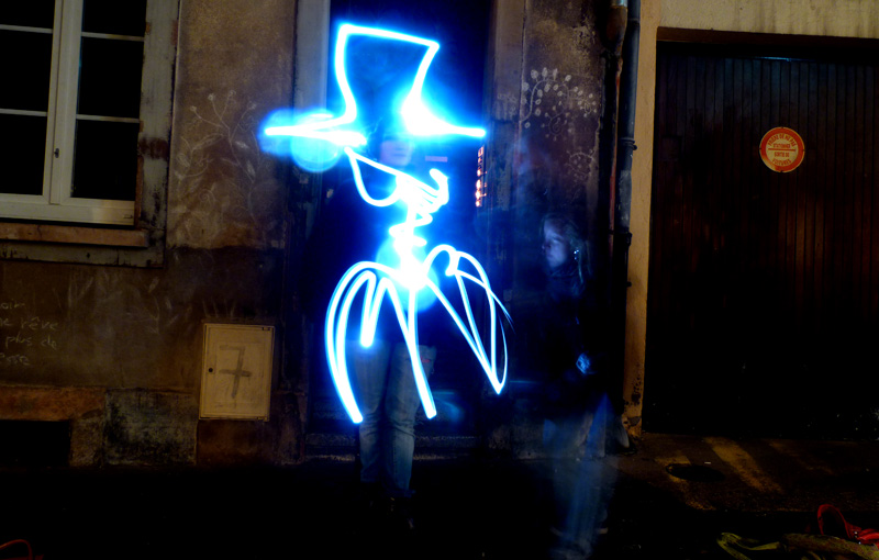 Différentes sources lumineuses sont à disposition afin de découvrir en toute simplicité cette pratique photographique méconnue. Les photos projetées en grand format permettent d’observer immédiatement le résultat. Ainsi les passants sont invités à entrer dans cette rue en coulisse de la Grand Rue autour d’une boisson chaude et d’une ambiance sonore et visuelle. A présent muni de sa petite lumière et guidé par les photographes, on avance dans la ruelle sombre en observant, jouant et dansant avant de reprendre son chemin.