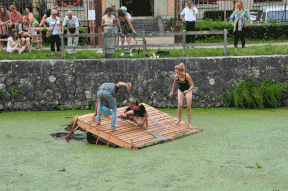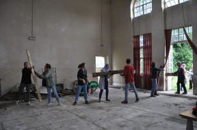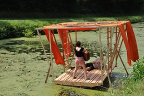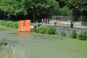 Le dernier jour, nous réalisons les clichés qui mettent en scène les structures. Tout le monde retient son souffle lorsque les terrasses de chêne s’enfoncent dans les lentilles d’eau. Ouf, ça flotte ! Elles tanguent pas mal, mais on arrive à peu près à naviguer et à stabiliser les planchers pour prendre les photos. On choisit alors un sujet apparemment inoffensif : le loisir. On met en scène les « temps libérés » que pourraient permettre de révéler l’usine comme le canal, et leur importance capitale pour repenser le rapport de notre société au « travail ». Plongée et natation, croisière romantique, scène pour spectacle sont des exemples de mise en valeur de ce patrimoine. On retourne alors les valeurs de « progrès » et de « productivité » liées à la naissance de ce bâtiment pour en faire un lieu de culture et de plaisir. C’est un vaste sujet pour des très-jeunes-presque-professionnels, et l’on poursuit nos discussions le soir au camping où nous loge l’ESAD et où les étudiants se sont installés un beau campement.
