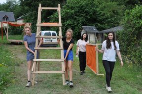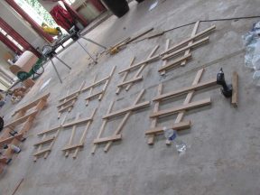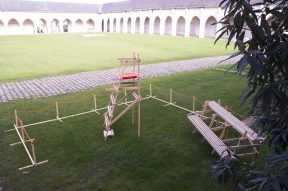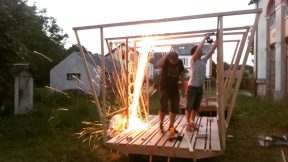 Les étudiants semblent ravis de se mettre à l’ouvrage, et sont confiants de la synthèse prête-à-construire que l’on a finalisé. Hormis l’odeur de vinaigre de cornichon, le soleil de l’été et l’ambiance champêtre de ce péri-urbain nous donne du cœur à l’ouvrage pour tenter de finir dans les temps les structures de tasseaux ambitieuses que chaque groupe finalise en même temps qu’ils la construit. On ajuste le tir face aux matériaux, on contrevente in fine des structures dont les étudiants prennent conscience, sous leurs mains, de la fragilité.