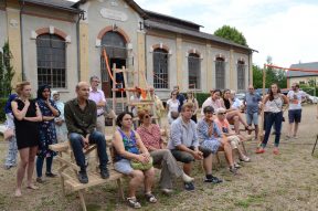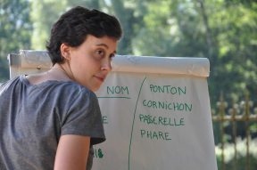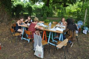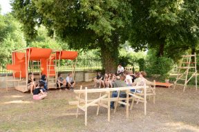 Si d’autres étudiants avaient déjà mené des pistes de projets sur l’alimentation ou les mobilités douces, on reprend collectivement les prémices de la question : que faire de ce délaissé industriel dans une commune péri-urbaine ? Si l’acte de faire est l’enjeu premier du workshop, on passe néanmoins les deux premiers jours à écrire ensemble le récit du projet, l’histoire à raconter derrière les formes que l’on va ensuite construire. Sur site, sous un soleil d’été généreux, on dresse les tables chaque matin puis on se répartit en petits groupes, en grands groupes, on discute avec François, on se promène sous les frondaisons, on partage les repas.