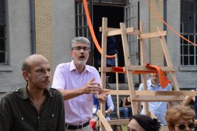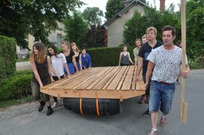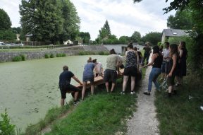 Dans l’après-midi, il devient évident qu’il nous faut investir le canal, et construire des radeaux. On en est à ce point du workshop où les choses basculent pour le meilleur et pour le pire, avec l’urgence d’une semaine de conception-réalisation. Et l’on décide tous que le meilleur serait justement de trouver des bidons pour pouvoir faire flotter des structures et, justement, une étudiante bien renseignée nous indique une usine à cornichons à 120 kilomètres de là. C’est idiot, on le sait, mais l’idée de rendre visite à nos amis de l’Arbre à cuire à côté de Tours finit de nous convaincre de prendre la route en fin d’après-midi. Bien que le nom de la commune où se trouve l’usine, Bourré, semble prémonitoire, nous promettons aux étudiants d’être de retour pour le lendemain matin, 9h30 sans faute, avec six bidons bleus.