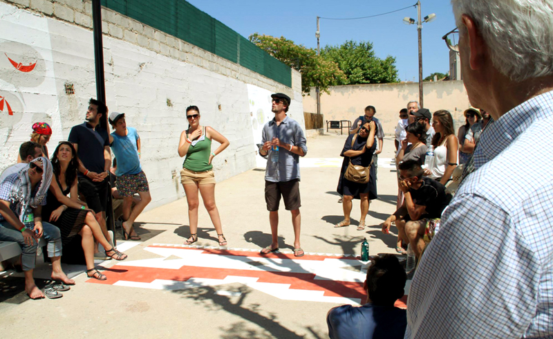 Le dernier jour, une visite des différents sites a été proposée, chaque groupe expliquant aux autres étudiants, aux encadrants et aux passants leurs intentions sur chacun des sites, avec un temps d’échange sur chacune des interventions.