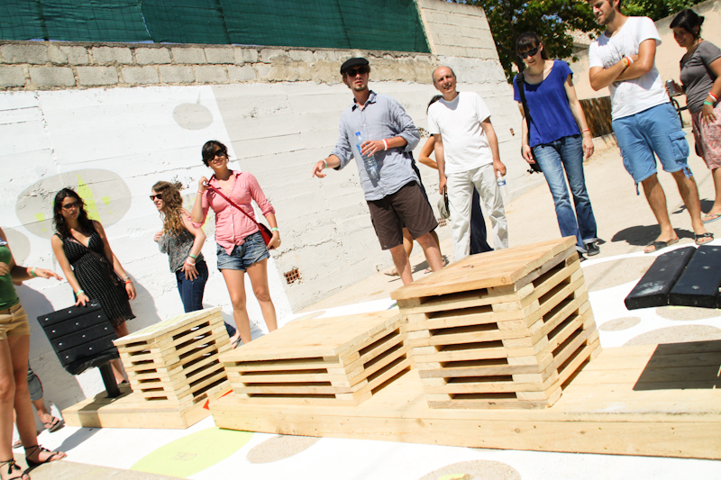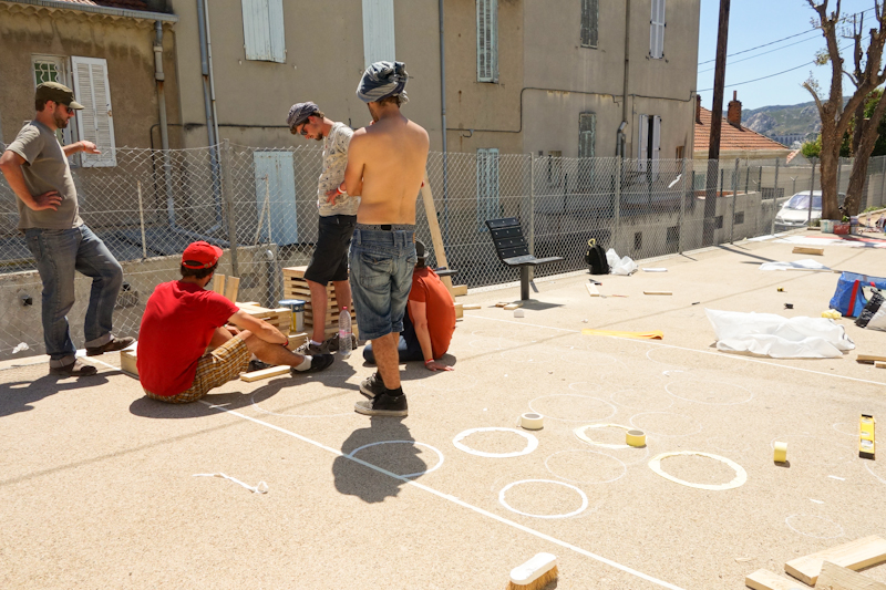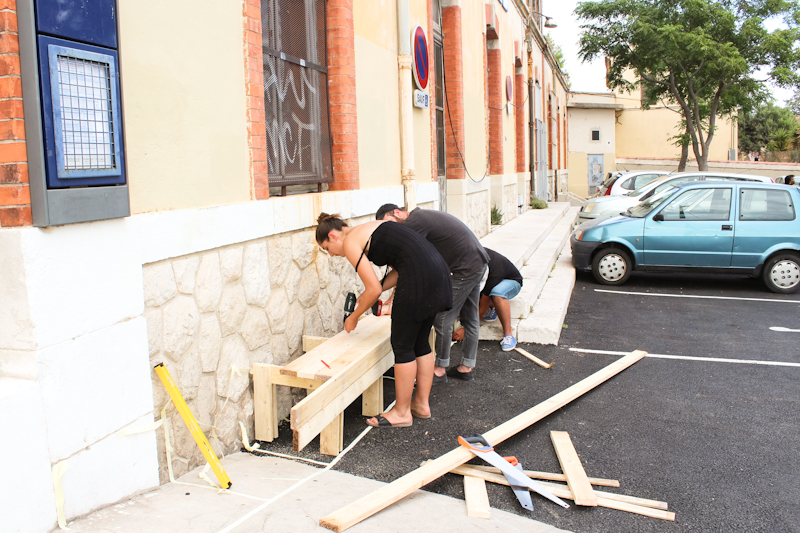 Ensuite, il est un point de notre pratique que nous avons voulu partager avec les étudiants : nous croyons que c’est pendant le chantier que des mouvements intéressants entre les gens sont provoqués. Par l’action créative, il devient possible de réagir sur des propositions concrètes, palpables. L’idée c’est qu’en faisant quelques chose, on provoque des réactions et des discussions. Vous noterez que ces interventions ne sont pas pérennes : elles sont donc modifiables, augmentables, ajustables, négociables. Rien n’est figé, et je dirais même que tout reste à faire.
