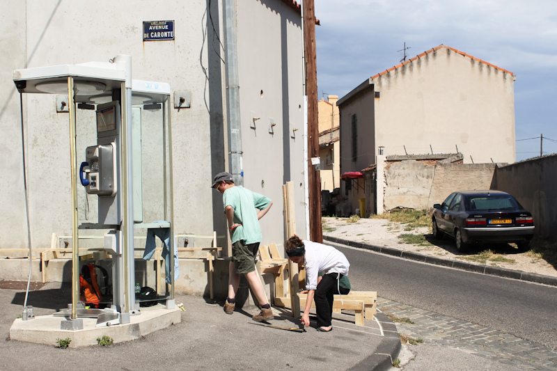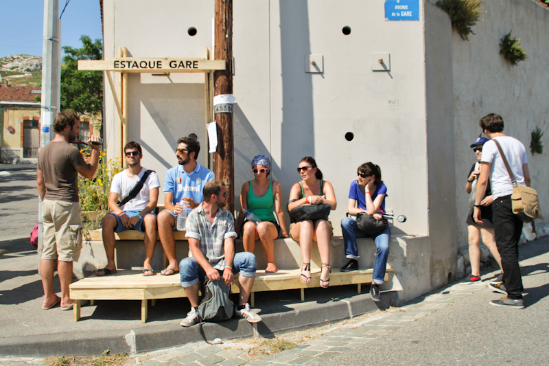 De plus, même si le camping éphémère nous a semblé particulièrement intéressant sur de nombreux points, comme l’auto-construction du projet ou la question qu’il pose par sa présence ici, il nous paraissait souffrir d’un manque d’ancrage sur le territoire de l’Estaque, jusqu’à lui tourner réellement le dos. Un des objectifs des actions était donc de tisser des liens entre ces micro-architectures disséminées dans la ville et le camping du quai de la Lave. L’identification facile, par les estaquéens, des étudiants aux campeurs, a permis d’instaurer des dialogues à une échelle spatiale plus importante que le simple lieu d’intervention.
