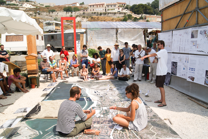 La restitution de cette deuxième séquence s’est déroulée à nouveau sur le camping éphémère de l’Estaque, et était ouverte au public. Quelques estaquéens et notamment des représentants des comités d’intérêts de quartier étaient présents lors des explications des étudiants amenant un débat basé sur des propositions stratégiques très diverses.