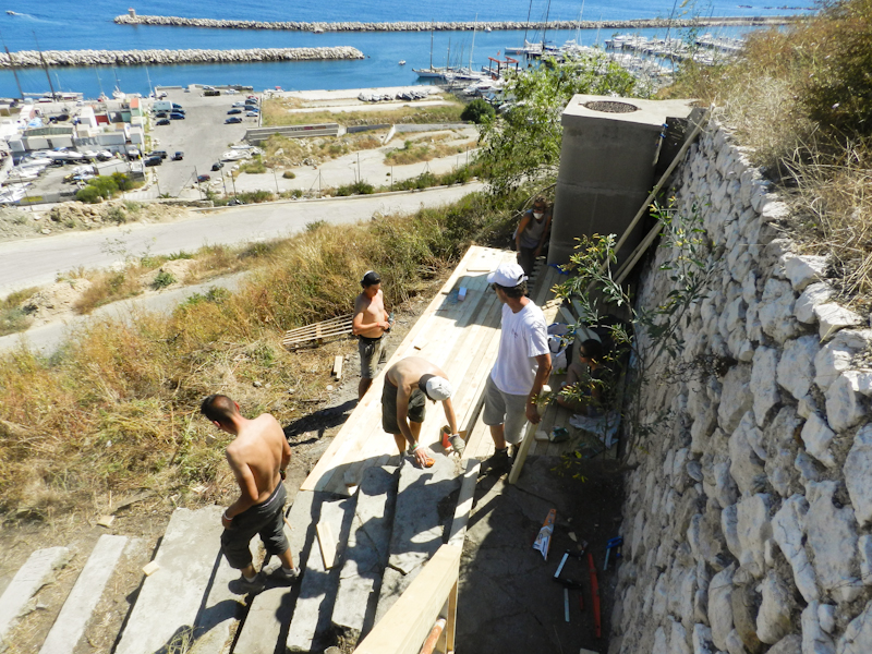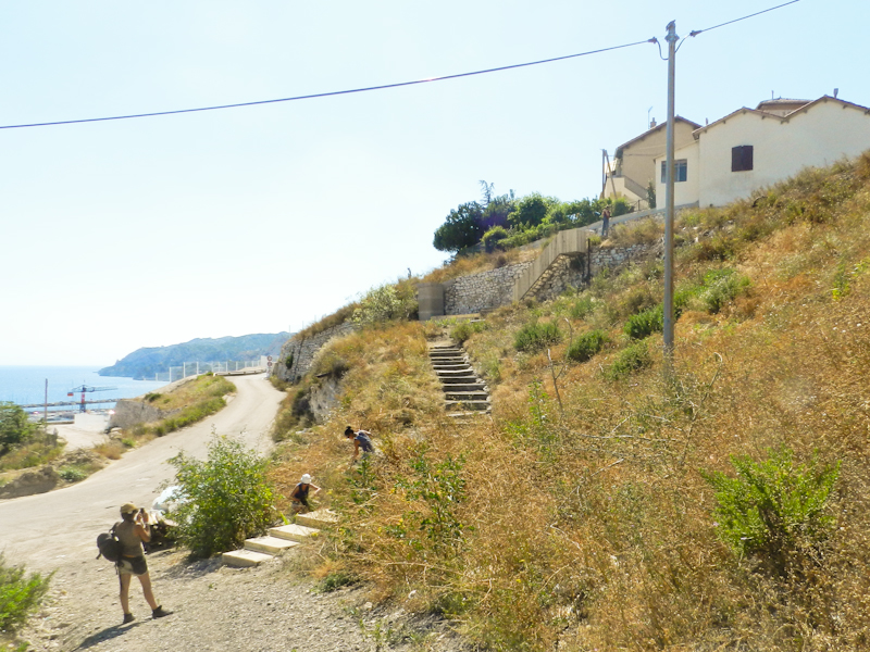 Le premier dimanche après-midi, une visite de l’Estaque a été organisée afin de présenter les sites d’interventions préalablement pré-sentis. Un escalier abandonné, sur la montée des usines, au passé industriel marquant ; le parc Mallot, square abandonné en plein cœur du centre historique du noyau villageois ; un délaissé au pied de la Cité Pasteur, symbole de l’éradication des bidonvilles de l’Estaque. Ainsi, trois sites, géographiquement, historiquement et socialement distincts, pour trois équipes composées d’une dizaine d’étudiants et de deux membres du Collectif Etc.