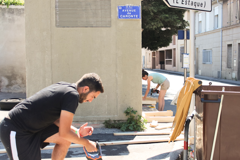 Pour le site de la montée des usines, nous avons pris le temps d’aller voir les habitants vivant à proximité du lieu de projet, taper à leur porte pour les prévenir de qui on était et de ce qu’on faisait ; nous avons pu discuter avec eux et leur demander conseil sur ce qui était juste ou non de réaliser. C’est à travers leurs points de vue que nous avons orienté et réajusté notre projet tout le long de la semaine. Certains venaient même nous voir régulièrement, nous apportant parfois parts de pizzas ou glaces. D’autres venaient même nous donner des conseils sur « comment bien scier une planche ». Ils semblaient pour la plupart très enthousiastes et impliqués, ayant bien compris que les premiers usagers concernés c’était eux.