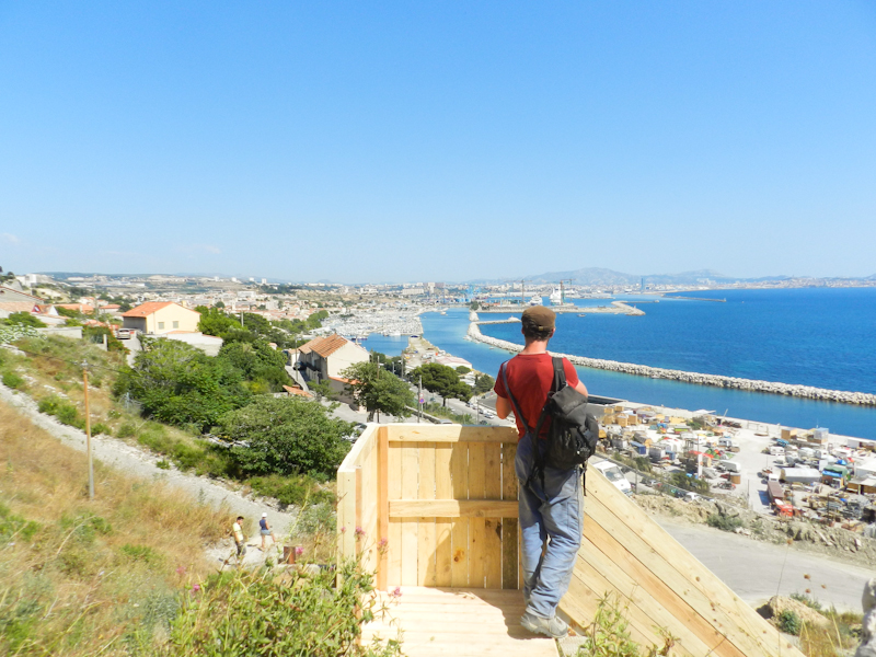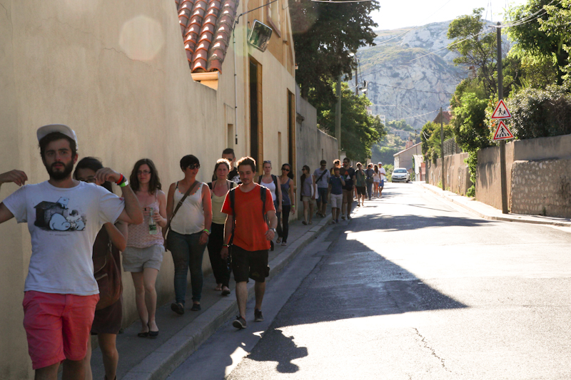 C’était l’occasion de relier les différents points d’intervention les uns avec les autres, ainsi que de mettre en avant leur rapport avec le quartier de l’Estaque, mais aussi avec le camping éphémère, les départs des balades commentées ayant lieu là-bas.