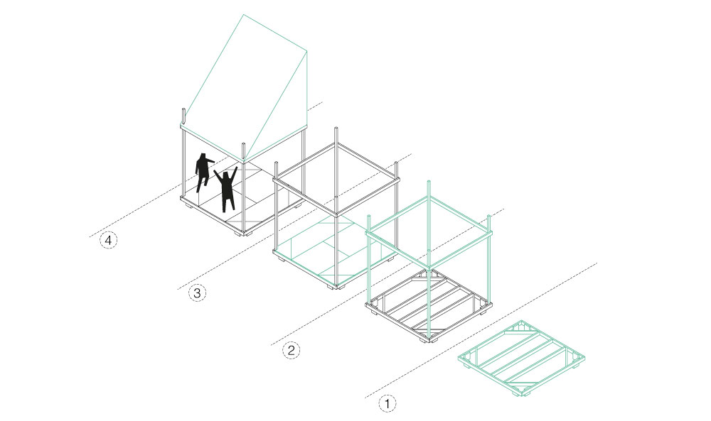 Notre mission était de trouver un équilibre entre ce que nous dessinions en amont, afin d’assurer une maîtrise formelle et structurelle du projet, tout en ménageant des espaces de créativité aux différentes équipes avec qui nous allions travailler. Nous sommes donc partis sur des modules tramés à 2,4m ( nous ne nous sommes pas fait système métrique local…) que chaque équipe pouvait composer suivant ses désirs, l’ensemble assemblé permettant de construire un espace cohérent par rapport au cahier des charges programmatique proposé. C’est une manière de faire que nous avons déjà expérimenté lors de divers chantiers et que nous appelons matrice constructive, soit les bases d’une infrastructure régulière, reproductible, non immuable et adaptée à un contexte paysager et culturel, support d’un ensemble varié et hétérogène dans sa forme mais régulier dans son format, d’éléments manipulables, issus d’une production industrielle, artisanale ou vernaculaire.