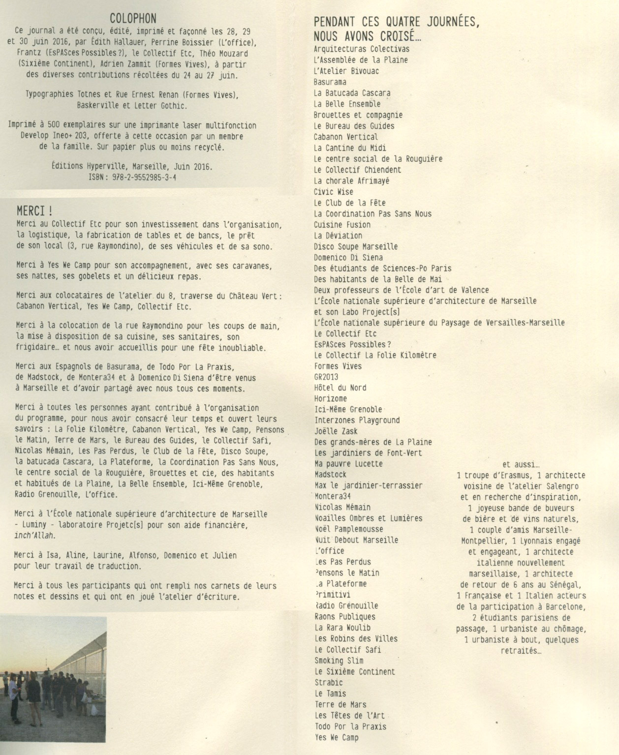 Ce que nous avons regardé, entraperçu, ressenti durant ces quelques jours, c’est ce que nous avons essayé de transmettre à travers les quelques pages d’un fanzine produit dans la foulée, somme polyphoniques de regard, comme pour nous rappeler que c’est par la diversité des manières de faire que nous construisons du commun.