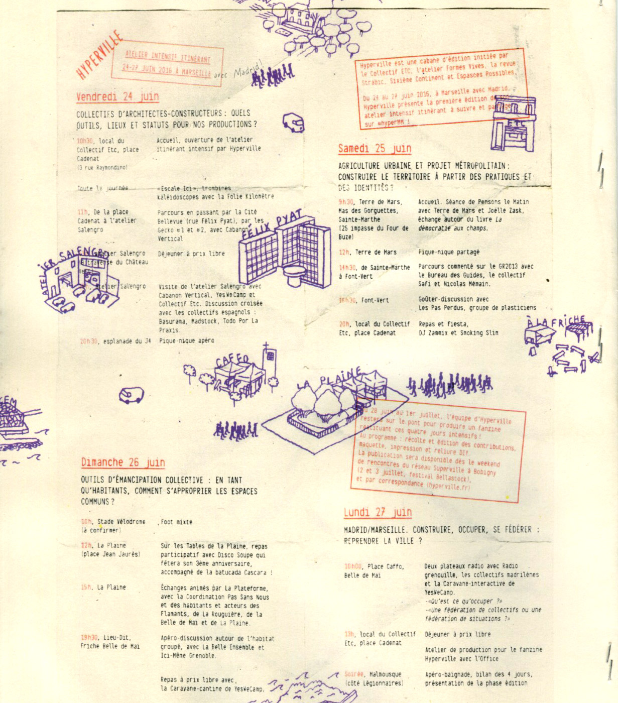 Du 24 au 27 juin 2016, au sein de l’équipe Hyperville, nous avons organisé cette première édition d’atelier intensif itinérant. Pendant quatre jours, nous avons arpenté le territoire marseillais. Par la marche, par des débats, par des rencontres. Et par des fêtes aussi.