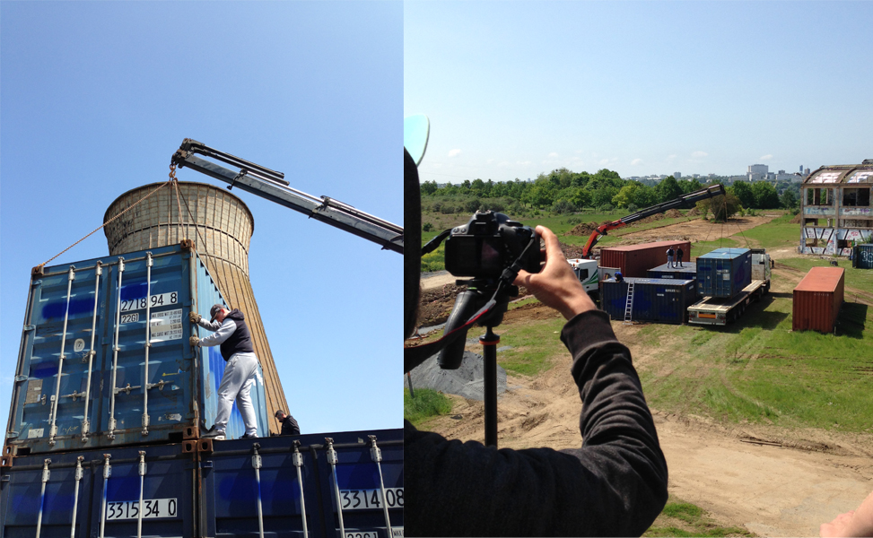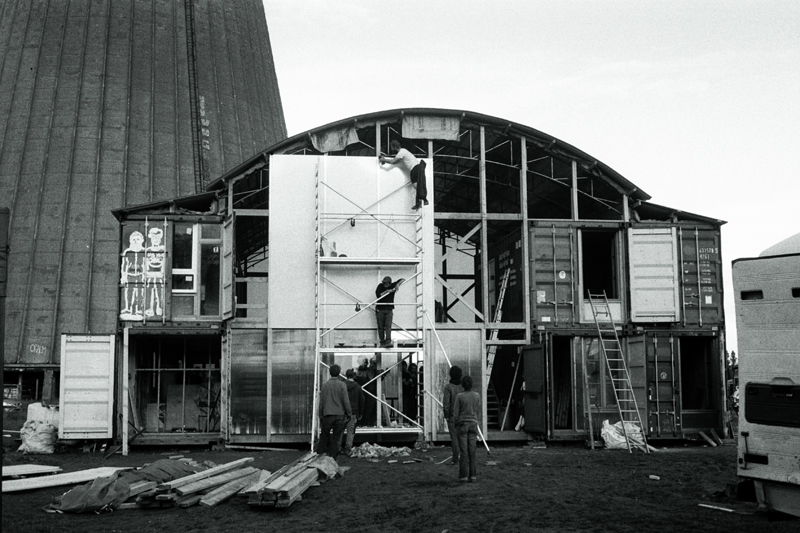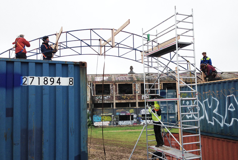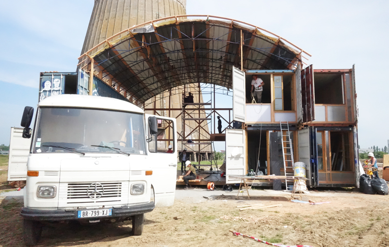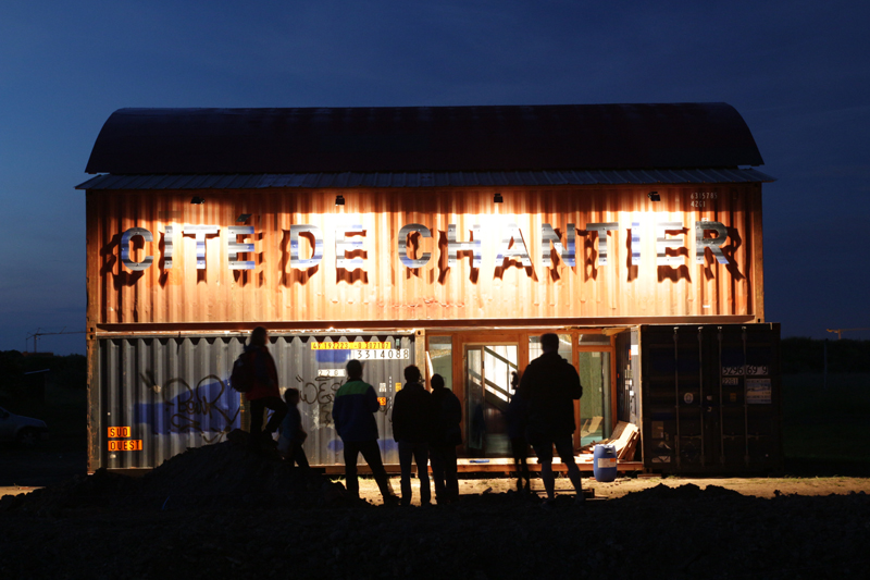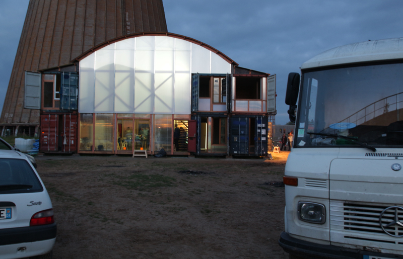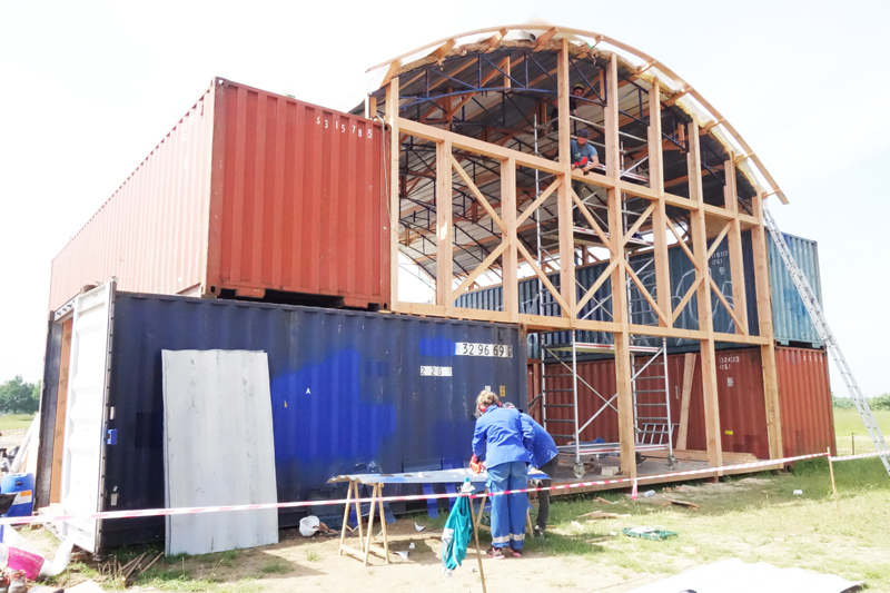 Premier jour de chantier nous avons implanté les fondations et calé les niveaux. Dès le lendemain une dizaine de containers arrivent un par un (au total 4 vingt pieds et 3 quarante pieds soit 10 EVP équivalent vingt pieds). Venant tout droit du Havre, achetés en dernier voyage, ils sont disposés « au millimètre » à la grue, lors d’une belle matinée ensoleillée. Ils matérialisent rapidement l’enceinte du lieu, son volume, sa structure.