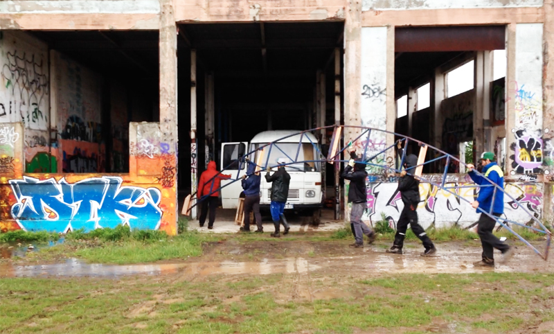 A proximité du chantier se trouve l’atelier de Art Itinérant. Marco et ses compagnons font tourner cette association dont une grosse partie de l’activité est la construction de mobilier à base de bois de palette bien désossées et rabotées. Ils ont élaboré pour l’occasion un modèle de chaise et de banc empilables dont une vingtaine de chaque meublent aujourd’hui la baraque.
