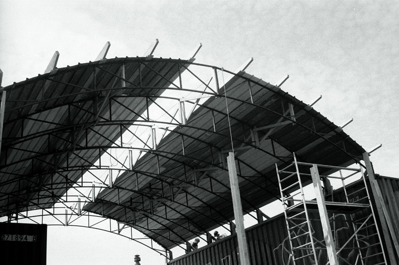 Après le beau temps, c’est la pluie, la boue et le fameux crachin de juin, qui nous ont accompagnés pour la pose de la charpente. C’est une ancienne structure métallique de chapiteau récupérée chez Breuil que nous avons périlleusement levée à l’aide d’une tour d’échafaudage et d’un palan. Les 8 fermes ont été boulonnées aux containers puis reliées entre elles par des croix de contreventements en douglas.