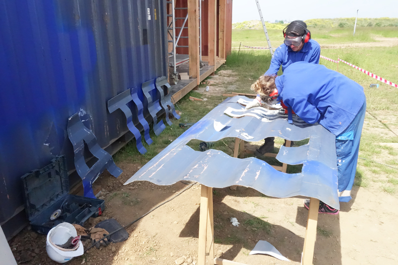 Les ailettes ont été couvertes avec du bac acier provenant du chantier de démolition de la miroiterie générale à Ifs (chantier NA).