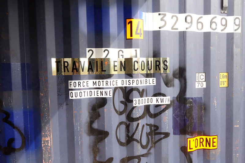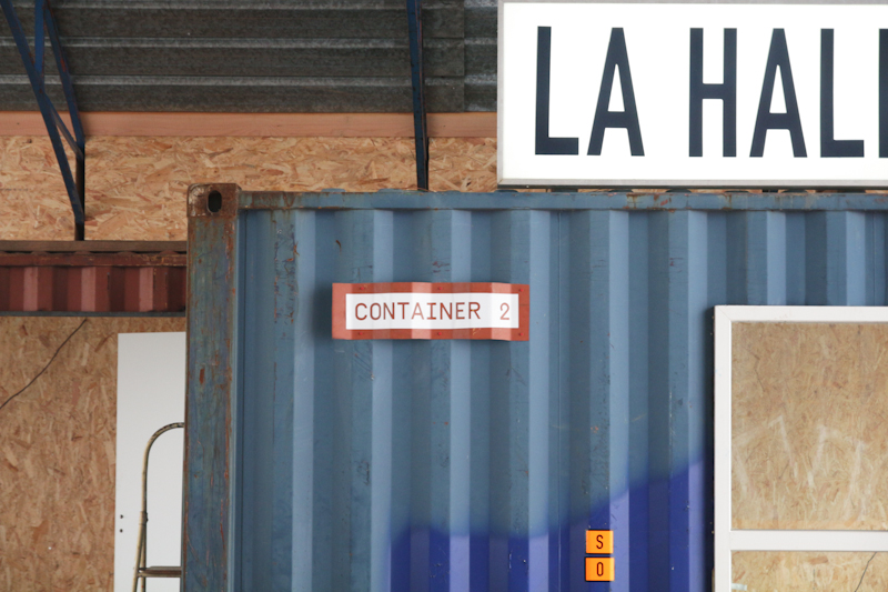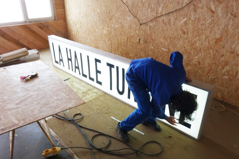 Super Terrain a décidé d’utiliser les restes de découpe des containers pour réaliser le lettrage, visible de loin, représentatif du bâtiment. Parallèlement, leurs recherches sur le contexte et l’histoire de la SMN, leur a permis de développer tout un travail graphique à l’intérieur comme à l’extérieur, servant notamment pour la signalétique du lieu. Comme un symbole, une vieille enseigne lumineuse achetée à Deauville sur leboncoin illumine l’espace de la nef centrale. La halle turbine.