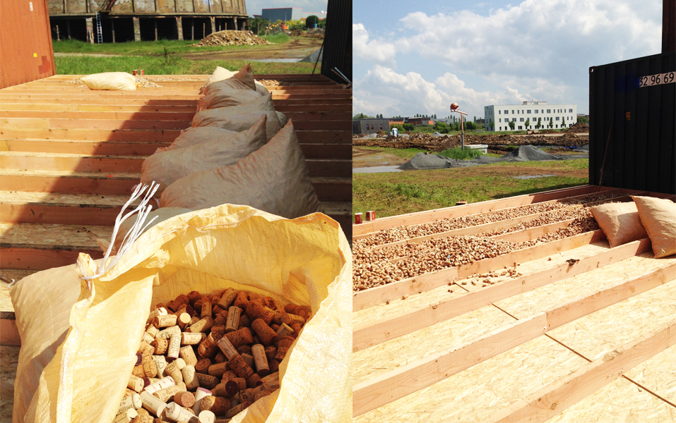Grâce à l’ARPE (Agence Régionale pour la Promotion de l’Eco-construction en Basse Normandie), nous avons fait la rencontre de l’association « Les bouchons du cœur ». À la retraite, récolteur professionnel de bouchons en liège dans la région, M. Delagneau, s’occupe, lorsque son containers est plein à craquer, de la revente de ceux ci à des entreprises qui les retraitent. Les bénéfices sont attribués à des aides aux handicapés. Nous avons profité de leur magnifique travail pour acheter une petite dizaine de mètres cubes de bouchons afin d’isoler les planchers de la nef centrale. Et qui sait, quand la baraque sera démontée, les bouchons pourront repartir dans la boucle et être revendus une deuxième fois. Double pactol pour l’asso !