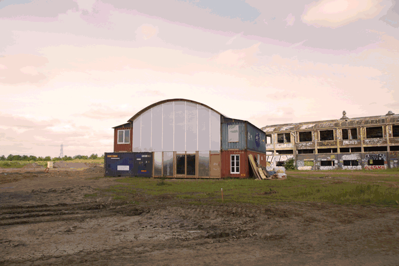 La construction de la baraque, étape forte du projet, se doit d’être cohérente avec les ambitions et l’identité de la Grande Halle et la volonté d’expérimenter de nouveaux modes de faire. Dans cette optique, Normandie Aménagement a lancé une consultation atypique de conception-réalisation, mettant l’accent sur l’utilisation de matériaux de réemploie ou recyclés, et sur une démarche de chantier ouvert. La base étant là, avec une esquisse programmatique et la promesse d’une dizaine de containers maritimes tout droit du port du Havre. Nous y avons donc répondu en janvier en proposant plusieurs phases de rencontre, recherche et de construction.