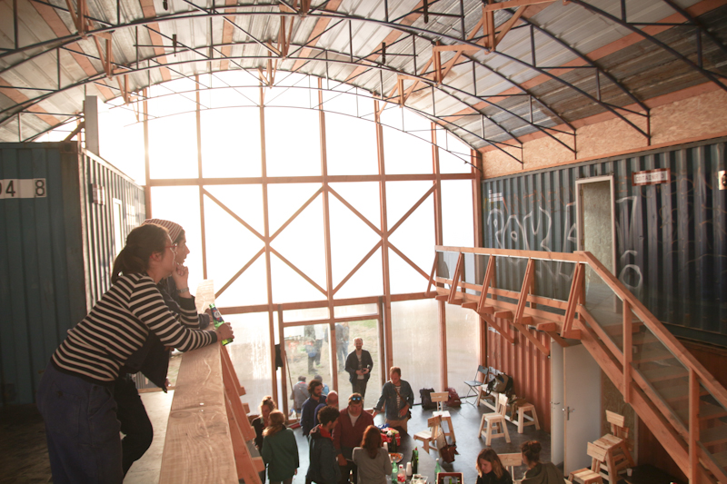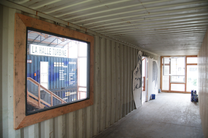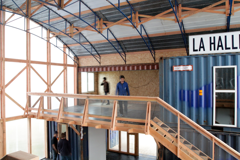 C’est le rush de la fin de chantier, on doit finir les espaces intérieurs alors que le bâtiment ne ferme pas encore. En premier lieux deux escaliers et une grande mezzanine qui distribuent les espaces de l’étage et encadrent l’espace de la nef ont été montés. Les gardes corps sont garnis avec de la tôle déployée qu’on a réussi a récupérer des chutes du chantier de la médiathèque de Caen, réalisée par l’OMA. Puis il faut se décider à arrêter d’utiliser les containers comme lieux de stockage et enfin découper les portes intérieures, quelques percements supplémentaires pour donner des vues vers le réfrigérant et aussi quelques baies donnant à l’intérieur de la nef. Les faces des containers donnant sur l’extérieur sont isolées et doublées de panneaux OSB. C’est la course pour trouver les dernières portes, adapter les serrures, un peu de plomberie… tout finir en même temps.