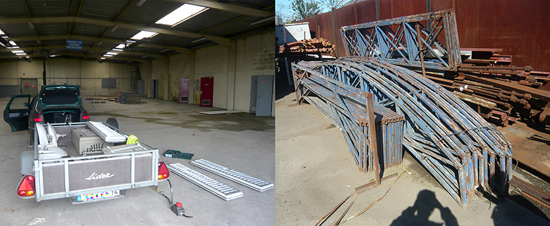 La plus importante découverte, qui a fortement modelé le projet et nous a sauvé la mise plusieurs fois pendant le chantier : les établissements Breuil. Un ferrailleur qui au lieu de tout broyer garde les pièces intéressantes et les revends au poids, une sorte de brocante métal. On y a d’abord dégoté une charpente de chapiteau qui collait parfaitement bien avec le projet et a transformé le profil de la baraque, en faisant un gros clin d’œil à la grande halle.