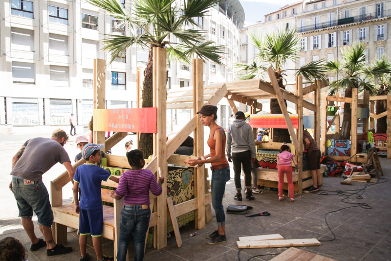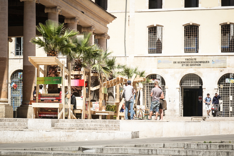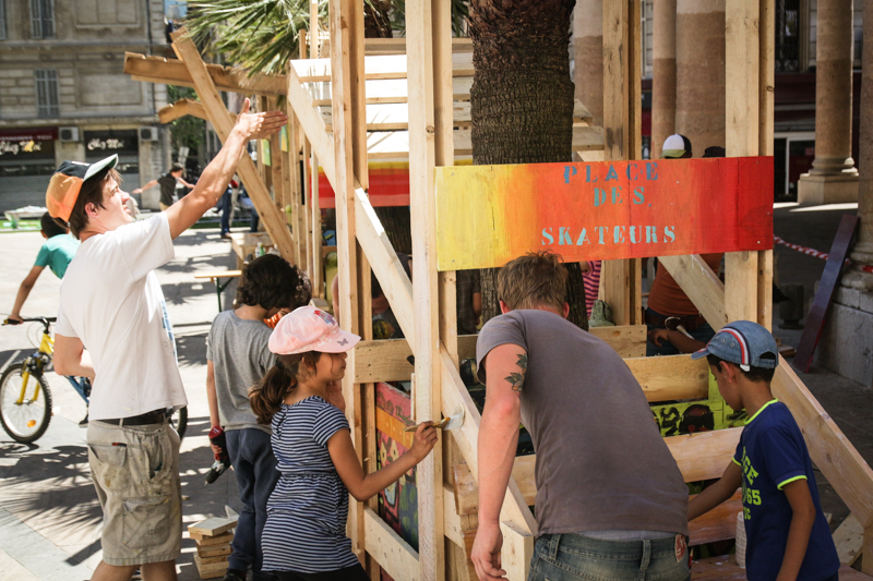 Un premier chantier s’est déroulé du mardi 5 au vendredi 8 mai, avec une inauguration de cette première phase lors de l’Atelier Aéré #3, le samedi 9 mai. Puis, durant quelques semaines, à raison d’une après midi par semaine sur la place, nous avons mené une série d’ateliers pour imaginer quel pourrait être le devenir de ce espace public. Nous avons travaillé autour d’une grande maquette et sur des photomontages.