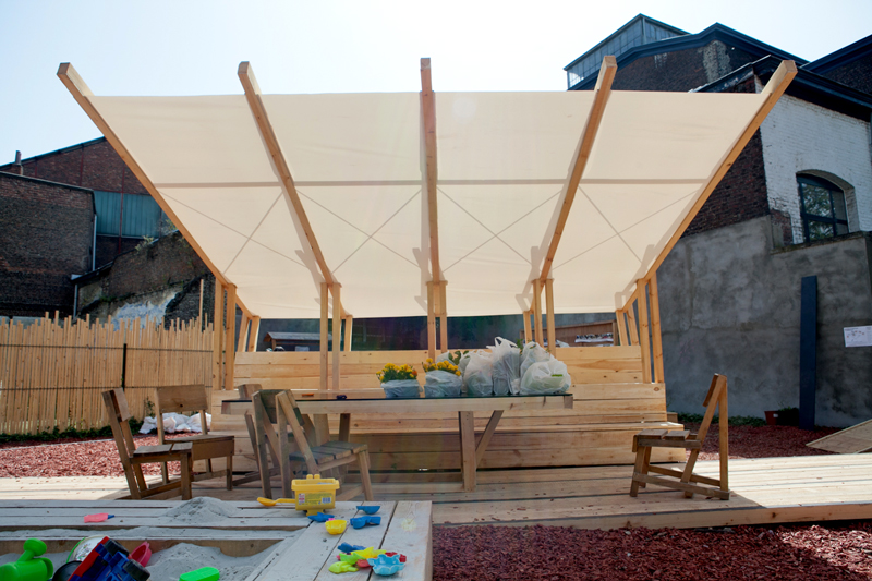 La structure est placée de façon à relier les deux allées en béton existantes et donc les deux entrées du site. Elle crée en plus un appel depuis la rue. L’abri est composé de cinq portiques en bois, lestés par les plots en bétons présents sur le site à l’origine. La toiture est recouverte d’une bâche étanche tendue entre les portiques.
