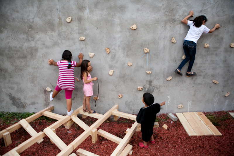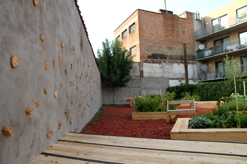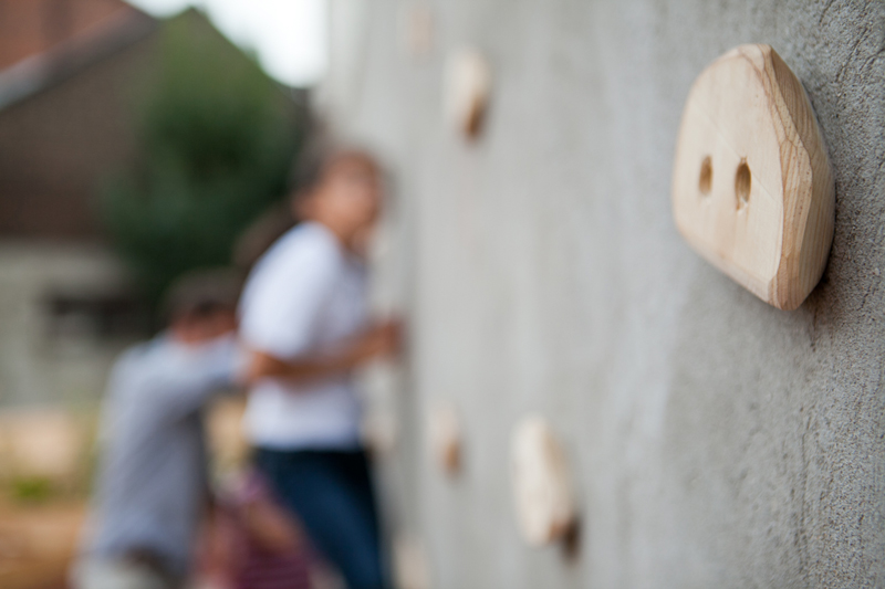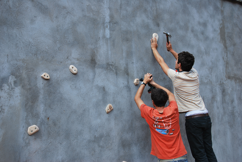 Sur la base des expérimentations de la phase 2, tout le mur du fond a été transformé en terrain d’escalade. Des prises en bois ont été découpées, poncées, puis fixées au mur.