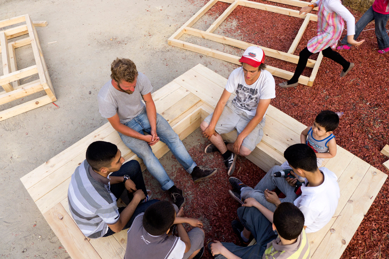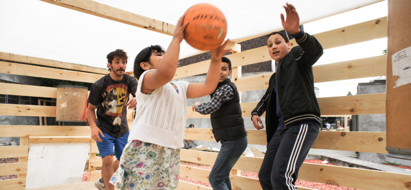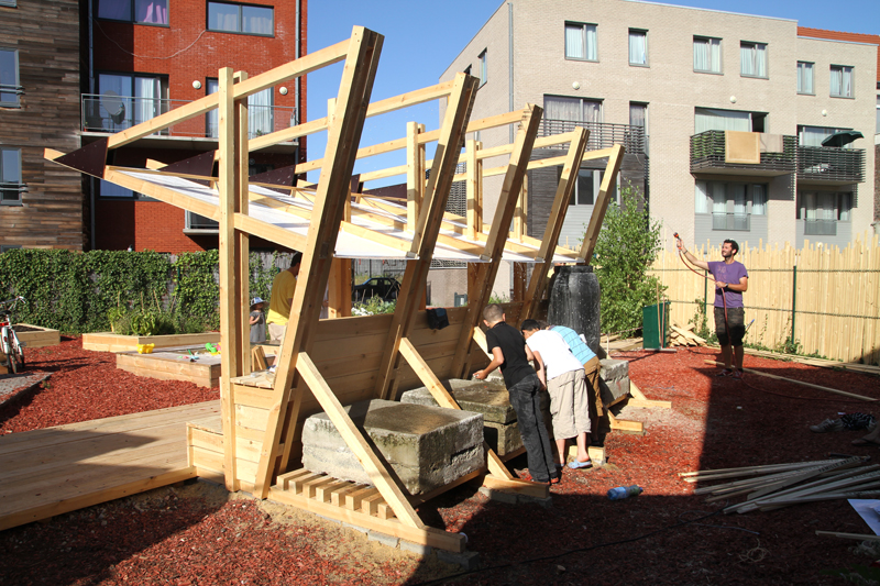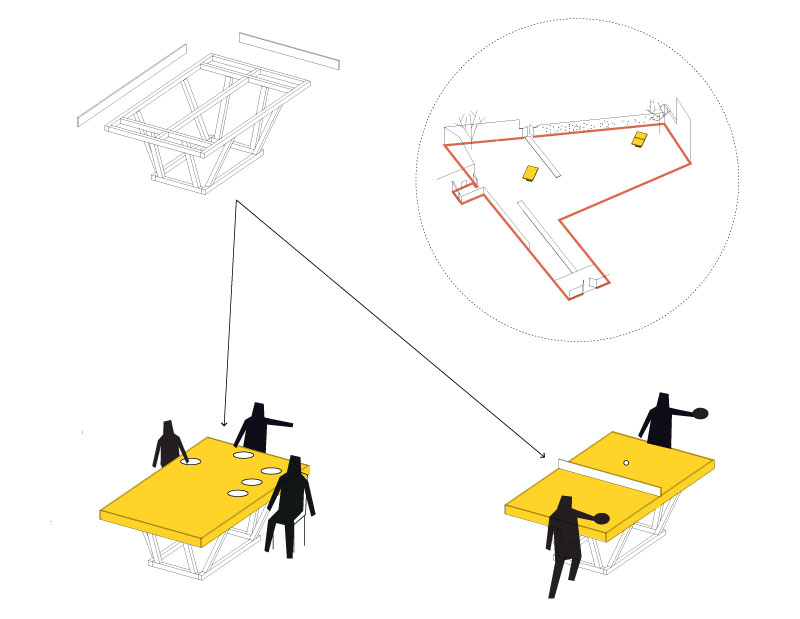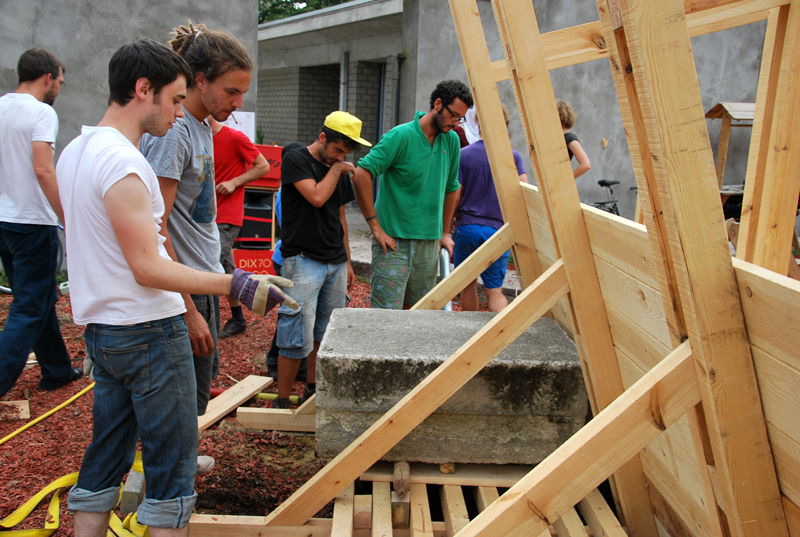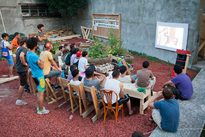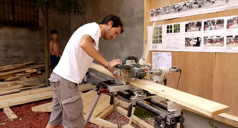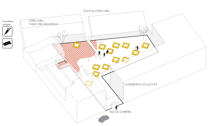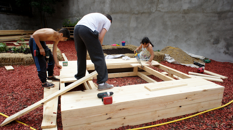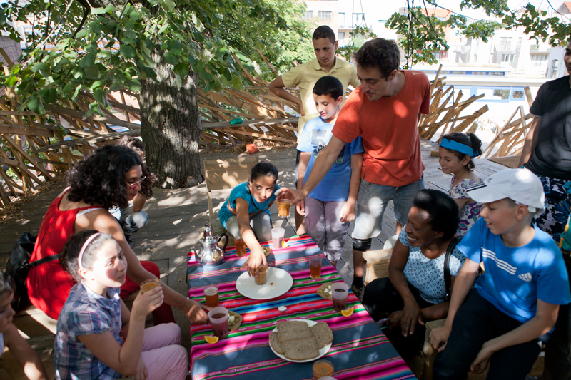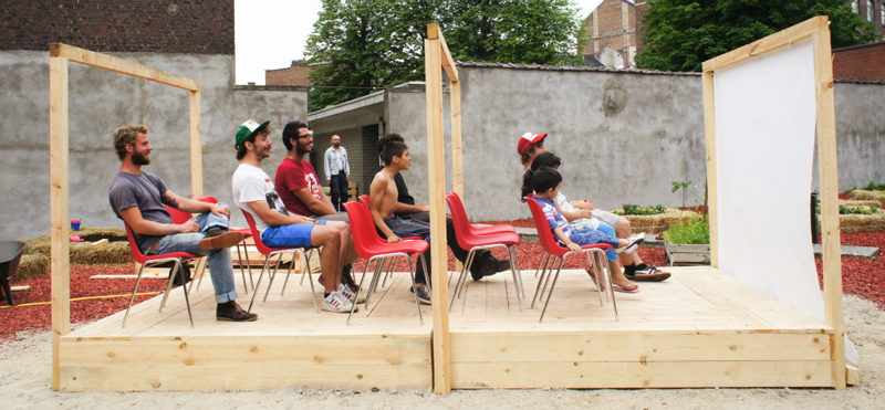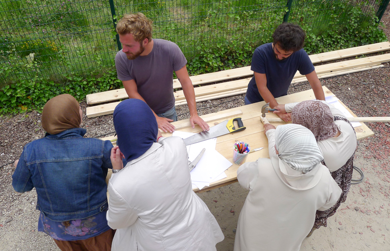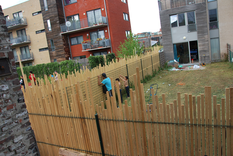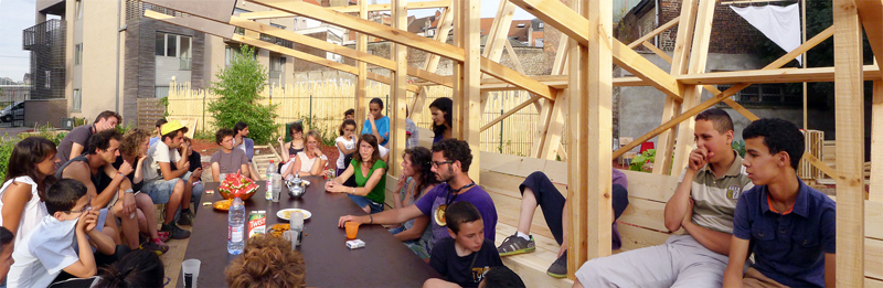 Afin que cet espace devienne agréable et vivant, nous avons questionné l’imaginaire de tous afin de trouver des solutions pour compléter la vie autour du jardin. Nous avons donc proposé de tester différents usages de ce lieux, en construisant un seul socle en bois qui s’est vu transformé chaque jour pour intégrer de nouvelles fonctions : un jour c’était barbecue, un autre, cinéma, balançoire, escalade, piscine, football, basketball, etc . A chaque nouvelle installation, les gens étaient invités à la construire avec nous, puis à organiser des mises en scènes dont les photos ont permis de valoriser tous ces usages et d’en discuter. Ci dessous, est disponible un livret qui dresse un bilan de ces expérimentations et qui a été distribué aux habitants.