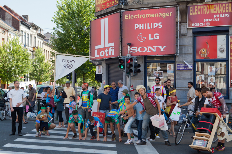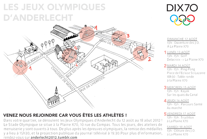 Pour cette dernière phase nous avons mis en scène un évènement pendant 1 semaine : les Jeux Olympiques d’Anderlecht. Le principe était de mobiliser les gens du quartier dans l’aménagement du jardin et la valorisation d’espaces publics alentours, par le biais d’animations sportives quotidiennes. Le quartier a été transformé en village olympique pendant deux semaines : Le jardin, c’était le stade dans lequel la remise des médailles avait lieu après chaque épreuve. Les jeunes courges et potirons ont vus se dresser devant eux tribunes olympiques et piste d’athlétisme. Sur un rayon de 500 m autour du Stade/Jardin, cinq lieux dans le quartier ont successivement accueilli une épreuve sportive par jour. Ont participé à ces épreuves les enfants, des passants et des associations de quartier. Nous avions choisi ces endroits pour leurs intérêts urbains et comme pour le stade, nous y avons installé du mobilier urbain déguisé en équipements sportifs. Un journal télévisé quotidien retranscrivais le déroulement des épreuves et un site internet spécifique a été créer pour communiquer sur l’évènement : http://anderlecht2012.tumblr.com/