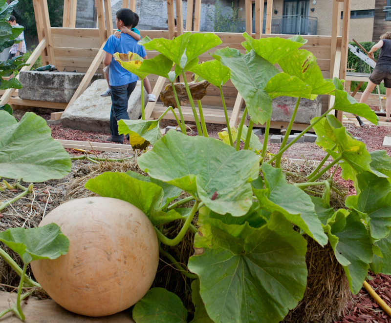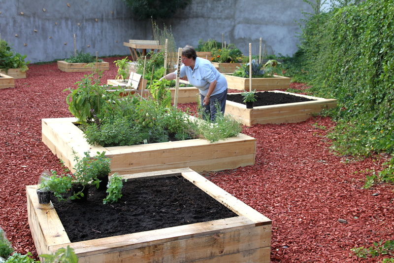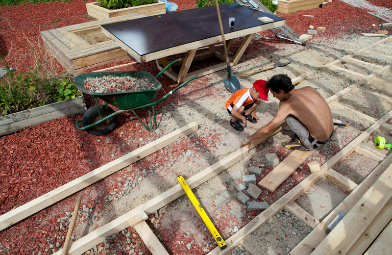 L’utilisation de la paille a permis d’aménager le site très rapidement en phase 1. Cependant ce matériaux était temporaire pour des bacs à jardiner et il était nécessaire de le remplacer par une structure en bois. L’opération s’est effectuée sans déraciner les plantes déjà mûres et la trame s’est densifiée pour créer des bacs supplémentaires à la demande des habitants.