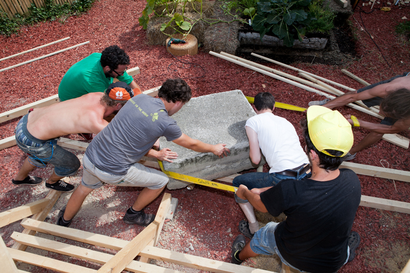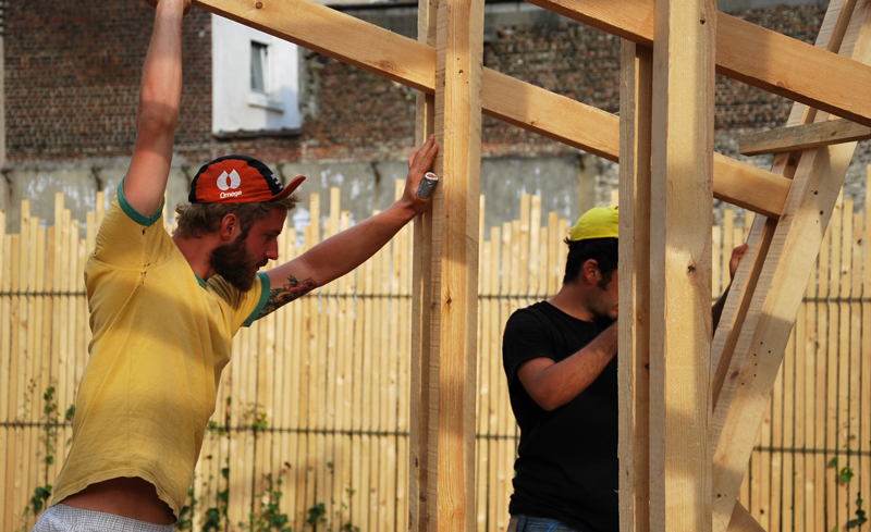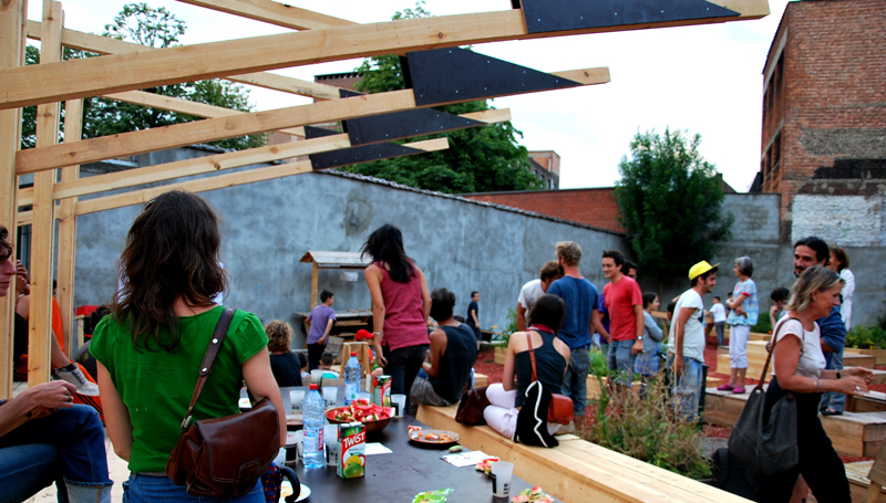 Le cadre de Parckdesign 2012 nous a amené à travailler dans un lieu qui avait été proposé par la ville. Une fois que notre projet s’est trouvé sélectionné, nous sommes allé sur le terrain et avons rencontré des habitants qui ne savaient pas encore ce qui allait se passer en bas de chez eux, dans ce qu’ils considéraient comme leur « terrain vague » privé. Cependant, ils étaient la clef nécessaire à la réussite du projet. Pour cela, il a fallu réunir ces nouveaux voisins, leur expliquer le projet, leur accorder du temps, les inviter à participer, à s’impliquer. Combien de rendez-vous ? Combien de coups de gueule ? Combien de journées de permanence pour OST, les seuls bruxellois de notre équipe ? Combien de fois on a cru que la porte du jardin se refermait pour de bon ? Nous avons organisé de nombreux temps de parole et nous avons pu construire une relation de confiance avec les voisins qui prenaient progressivement conscience de l’intérêt d’un tel jardin.