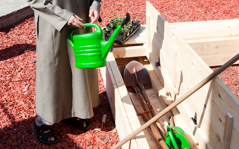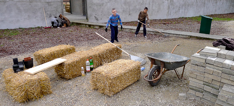 Tout d’abord 3 modules supplémentaires ont été construits qui s’intègrent dans la trame des bacs en paille. Ils ont respectivement pour fonction des assises, des rangements d’outils de jardinage et un bac à sable. Ils ont été réalisés avec l’aide de voisins.