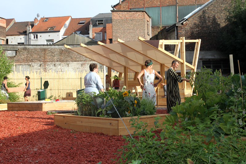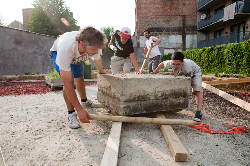 L’objectif était de transformer un de ces délaissés en un lieu partagé géré de façon collective, comportant jardins potagers, aires de vies et équipements sportifs. Cet espace est à l’écart de la rue, situé entre deux immeubles d’habitations collectifs et un centre associatif nommé le Cüro-Hall. Sa situation est tellement proche des immeubles d’habitations que leurs résidents peuvent se considérer comme usagers privilégiés. La stratégie est de s’appuyer sur ce groupe d’usagers et leur intérêt pour le jardinage afin de re-dynamiser cet espace en en faisant un lieu d’échange et de sociabilité. En mettant en place un collectif d’habitants à la fois autonome mais aussi ouvert aux autres et en diversifiant les usages, nous avons souhaité parvenir à une gestion équilibrée entre la ville de Bruxelles, ce collectif d’habitants et les autres usagers potentiels du quartier. Ce projet considère l’intervention artistique comme une entrée et il se veut aussi être social et culturel. Afin d’asseoir le projet dans la durée et d’associer les usagers concernés dans la transformation du délaissé urbain, le projet s’est déroulé en 3 phases sur une durée de cinq mois.