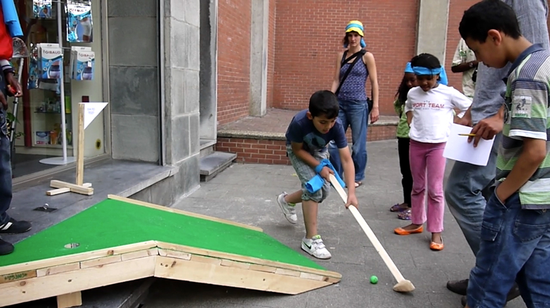 – Temps 1 : Dans le Stade/Jardin, fabrication des supports pour les épreuves (rampes de golf, gradins, tables de ping-pong,..).