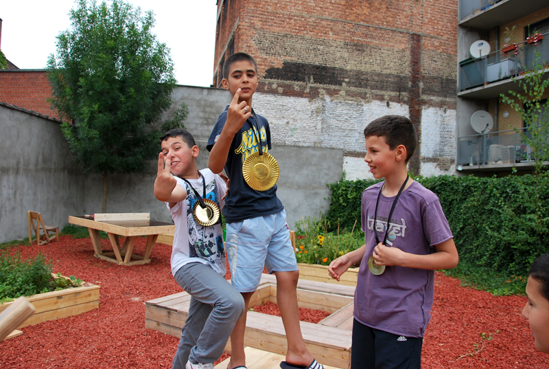 – Temps 2 : Les compétitions sportives on eu lieu sur les cinq lieux choisis dans le quartier. A la fin de la journée avait lieu dans le jardin la remise des médailles suivi de la projection du reportage télévisé de la journée.