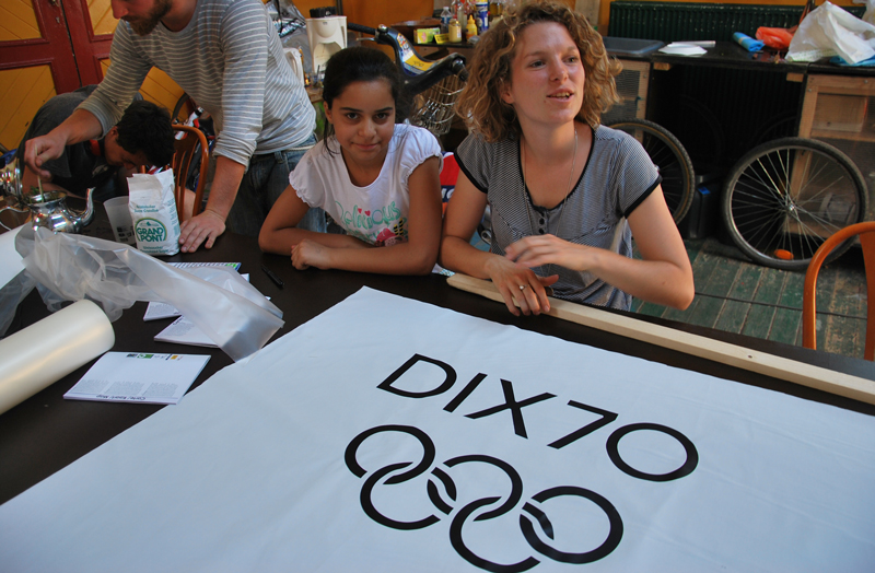 Le dimanche 12 août nous avons commencé par la cérémonie d’ouverture des jeux Olympiques. C’était une parade dans le quartier durant laquelle nous avons défilé avec les enfants en brandissant la flamme olympique tout le long du parcours des épreuves sportives imminentes. Plusieurs éléments de mise en scène avaient été fabriqués pour l’occasion : un drapeau du village olympique, une enceinte et un ampli sur roues, un tableau des scores, un micro pour le journal télévisé et des tenues de sportifs. Des flyers avec un programme de la semaine étaient distribués. Le but était de communiquer sur l’existence de ce jardin et d’inviter les gens du quartier à venir participer aux jeux olympiques