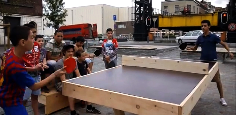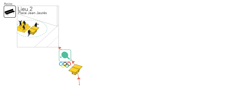 Le deuxième jour, c’était le ping-pong sur la place Jean Jaurès en face du canal. Le tournoi eut lieu dans l’après midi autour d’une table et d’un gradin construit à l’occasion. Certains passants se sont prêtés au jeu. En plus des tables de ping-pong, des petits gradins ont été construits pour le confort des spectateurs. Ces gradins étaient ensuite destinés à rester sur place en tant que banc public.