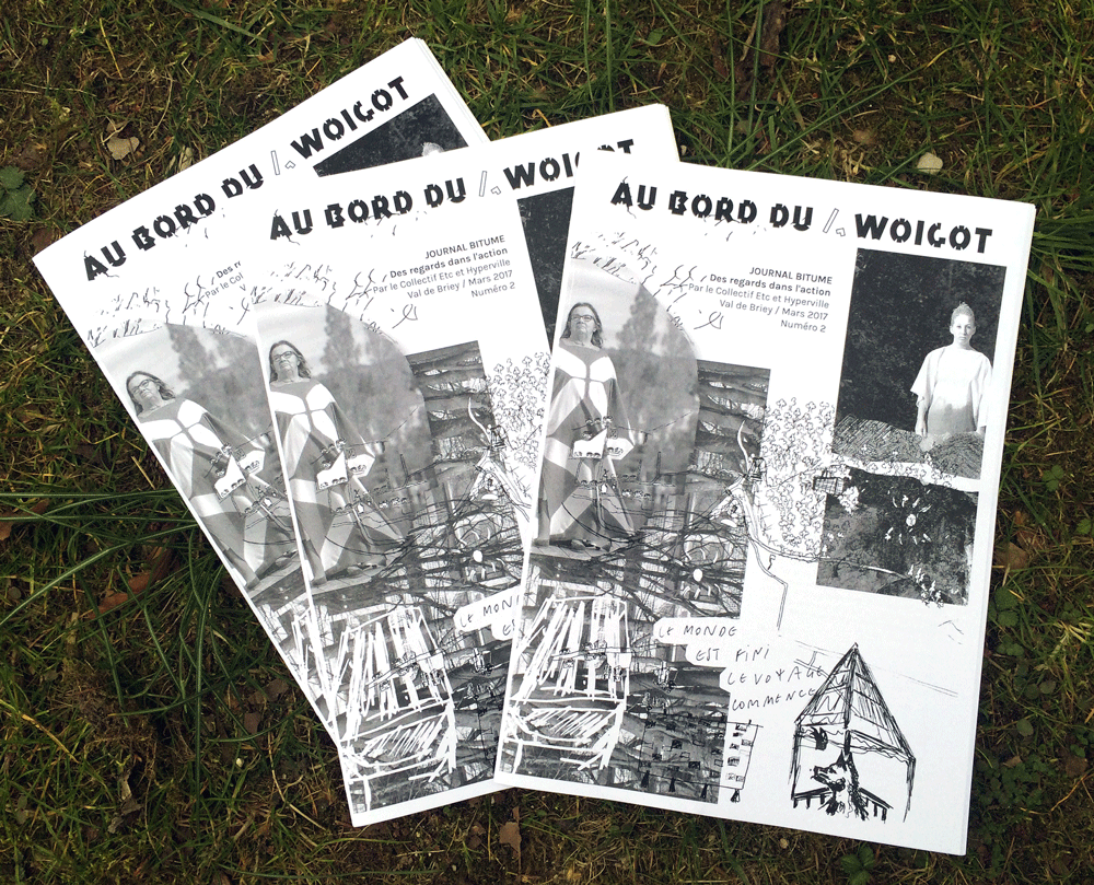 En janvier nous partons avec quelques membres de l’équipe mener des ateliers d’écriture. L’objectif est de composer avec les habitants des imaginaires liés au chantier et au film réalisés quelques mois plus tôt, au paysage qui les entourent et aux histoires qu’il évoque. Nous confectionnons au passage un dessin géant dans lequel la patte de chacun trouvera sa place. Les formats sont volontairement libres afin d’intégrer la diversité des envies. Nous y retrouvons une fiction d’anticipation sous la forme d’un compte rendu de réunion municipale de Maxime Gonzales, l’histoire de la chimère du Woigot écrite par Régine et le secret de la recette du poulet à la mirabelle, une spécialité du coin.